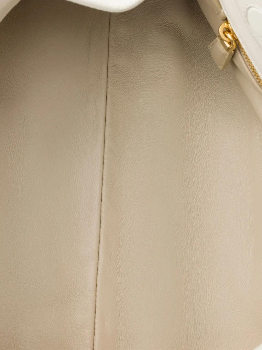 white leather construction gold-tone metal hardware hot-stamped logo chain strap magnetic closure