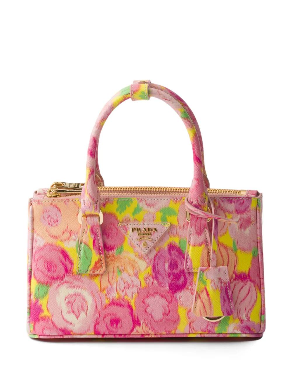 pink Saffiano leather floral print double top-handle detachable and adjustable shoulder strap zip fastening external zipped-pockets signature triangle logo
