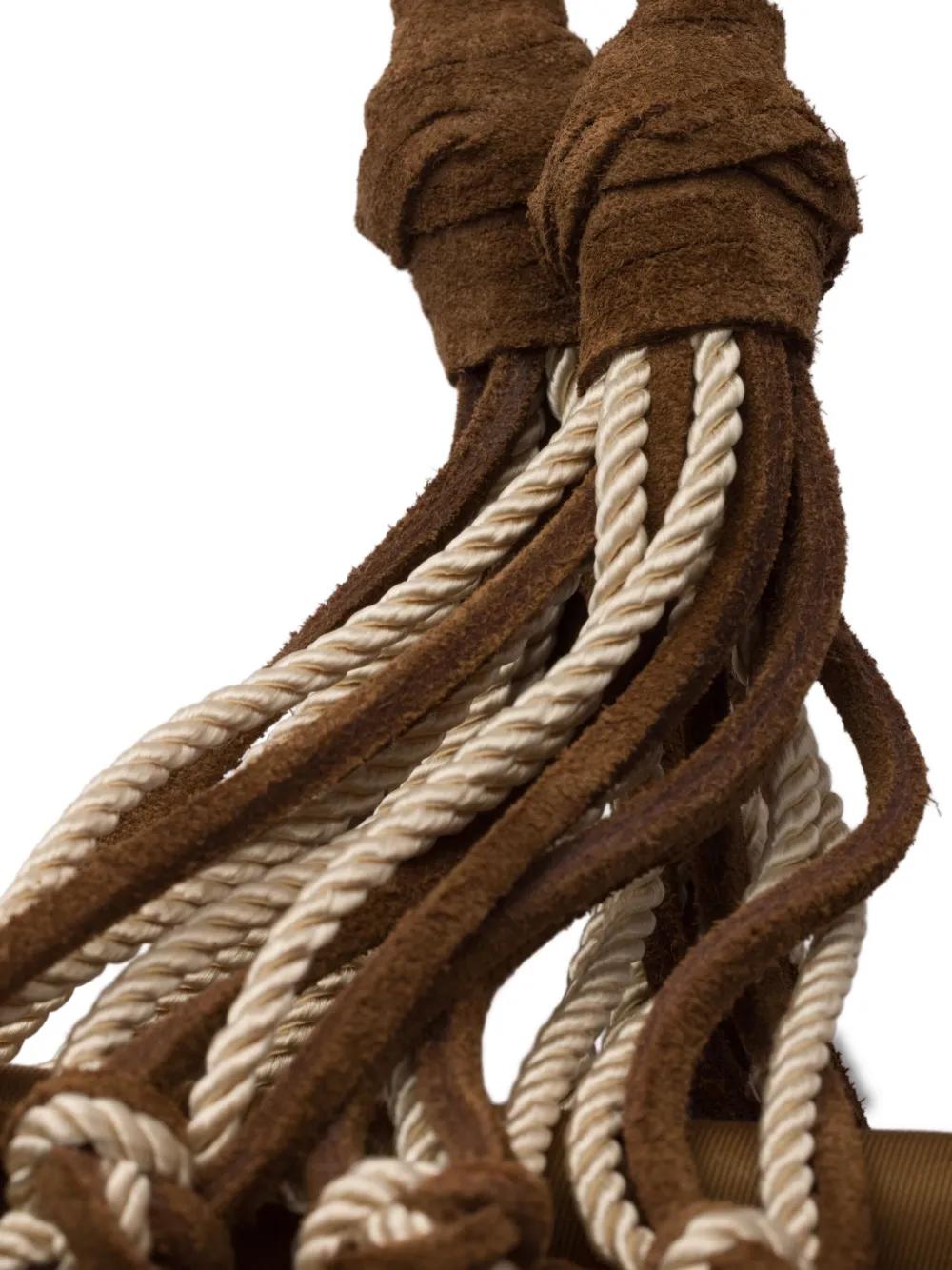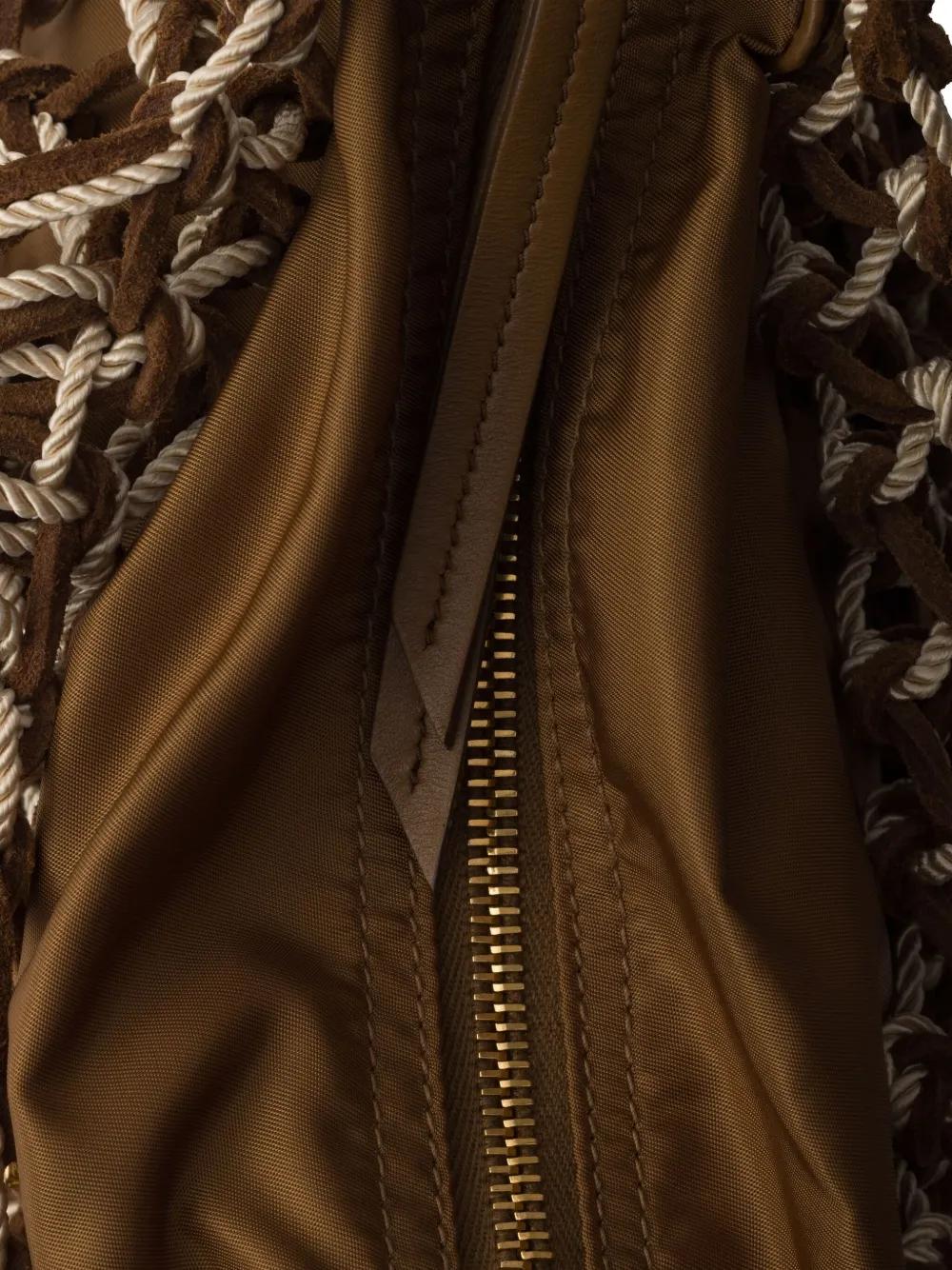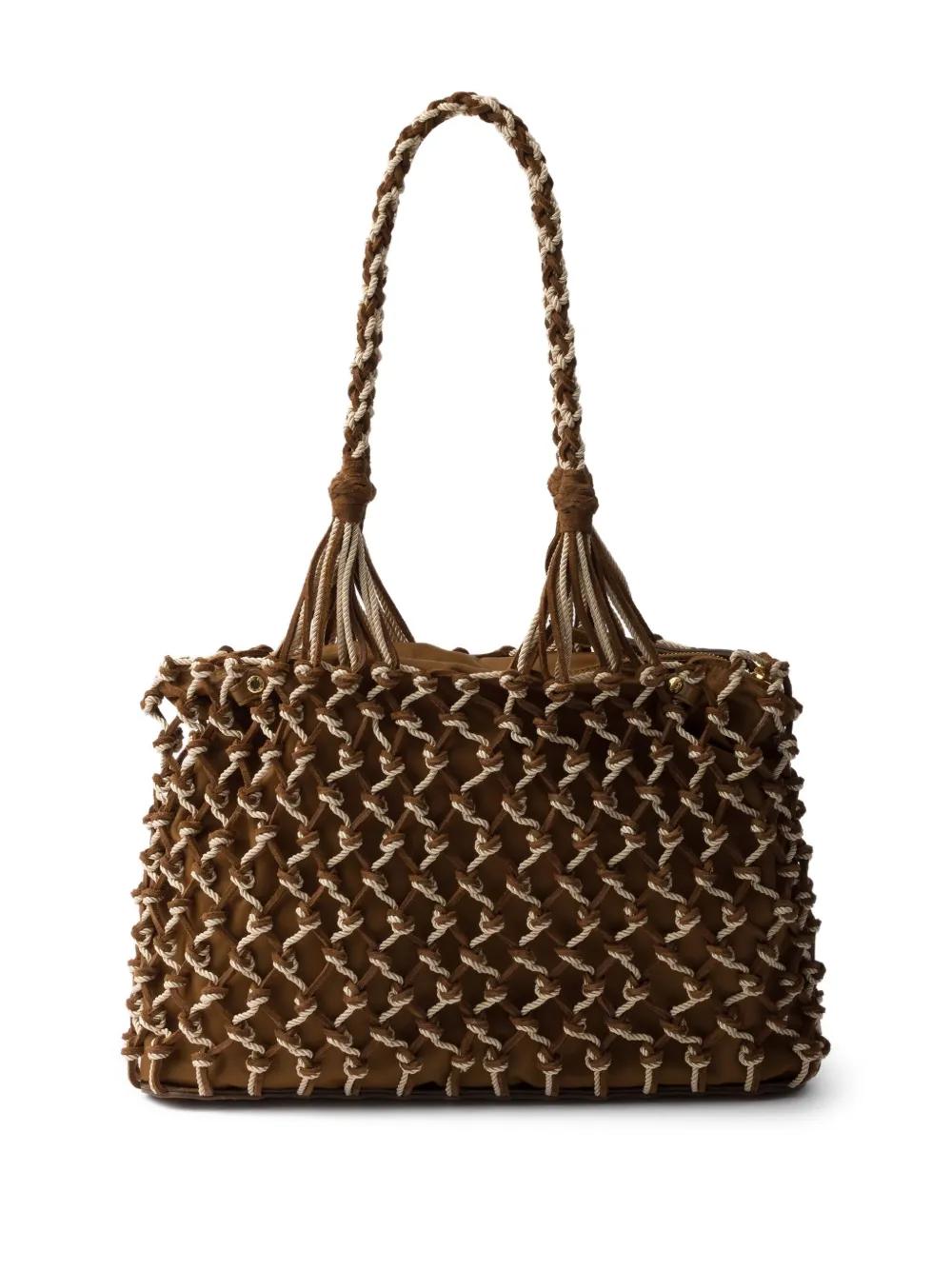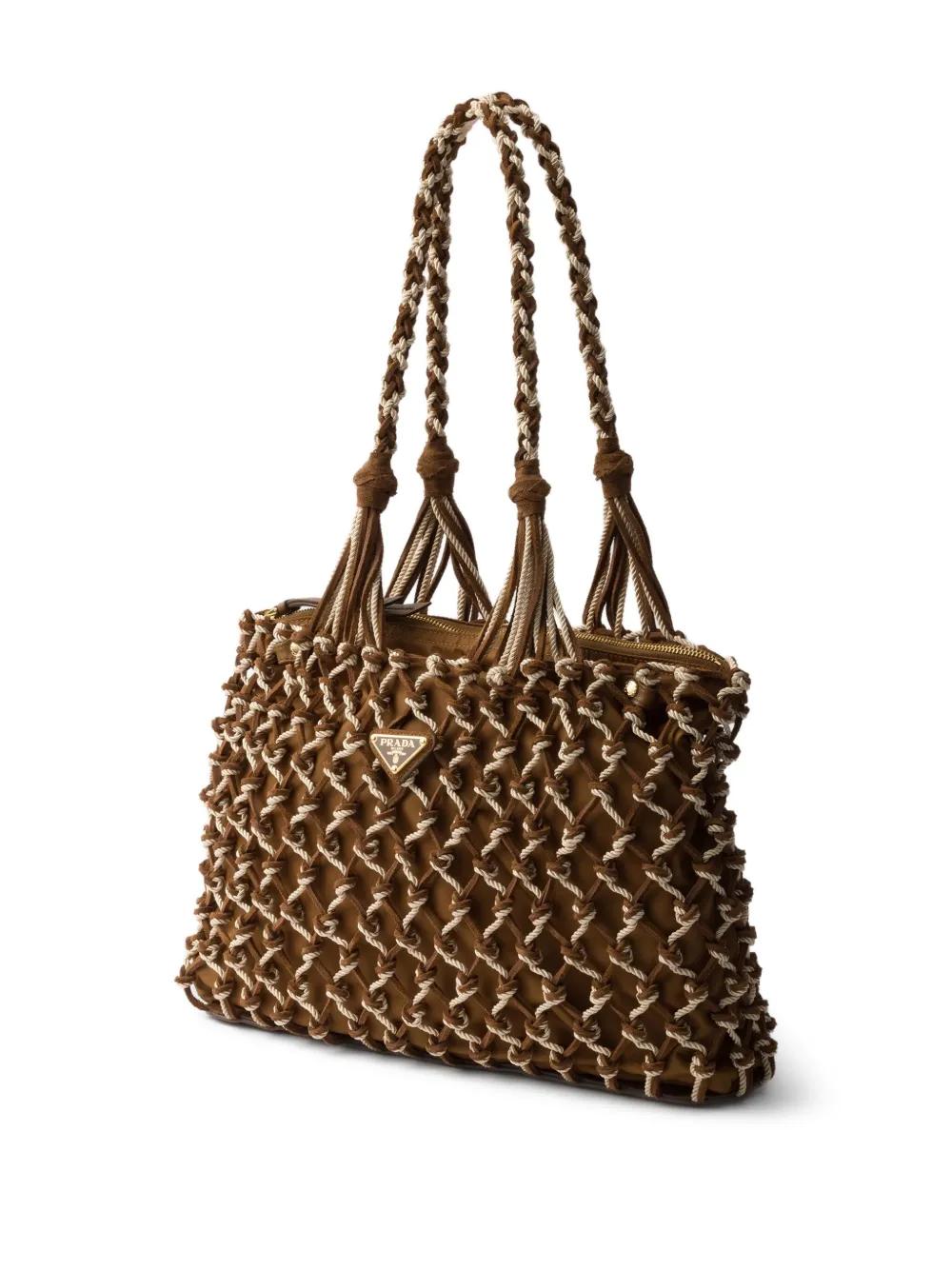 brown enamel triangle logo two braided shoulder straps top zip fastening
