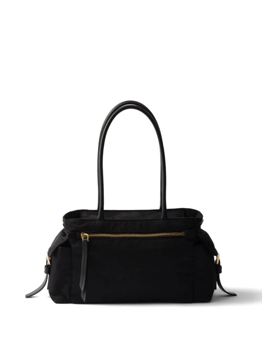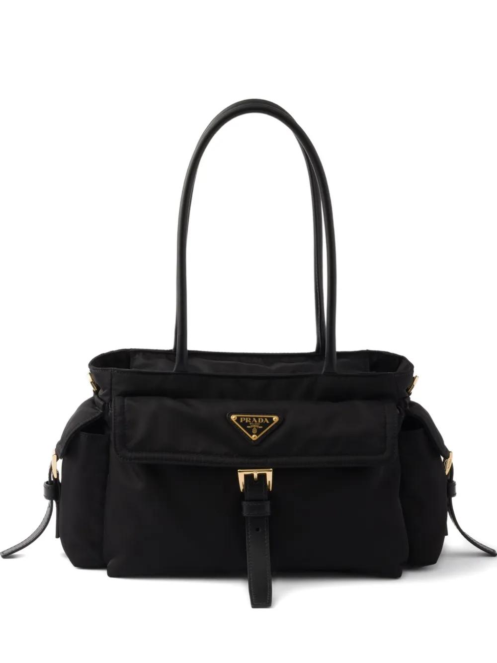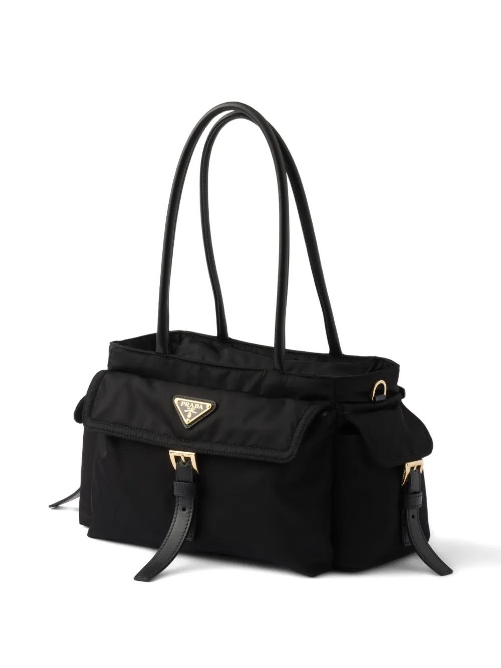 black metal triangle logo front zip pocket side pockets flap padded tape handle