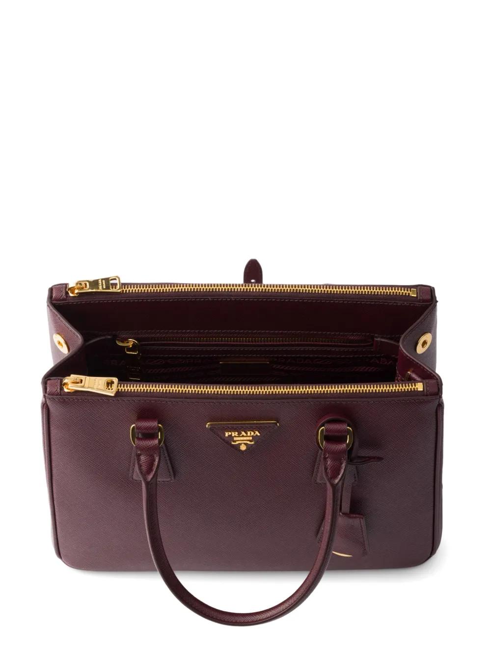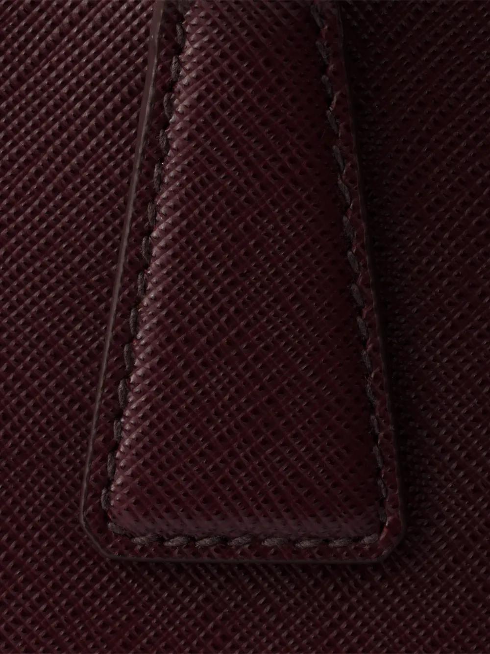 burgundy Saffiano leather double top-handle detachable and adjustable shoulder strap external zipped-pockets snap-closure sides