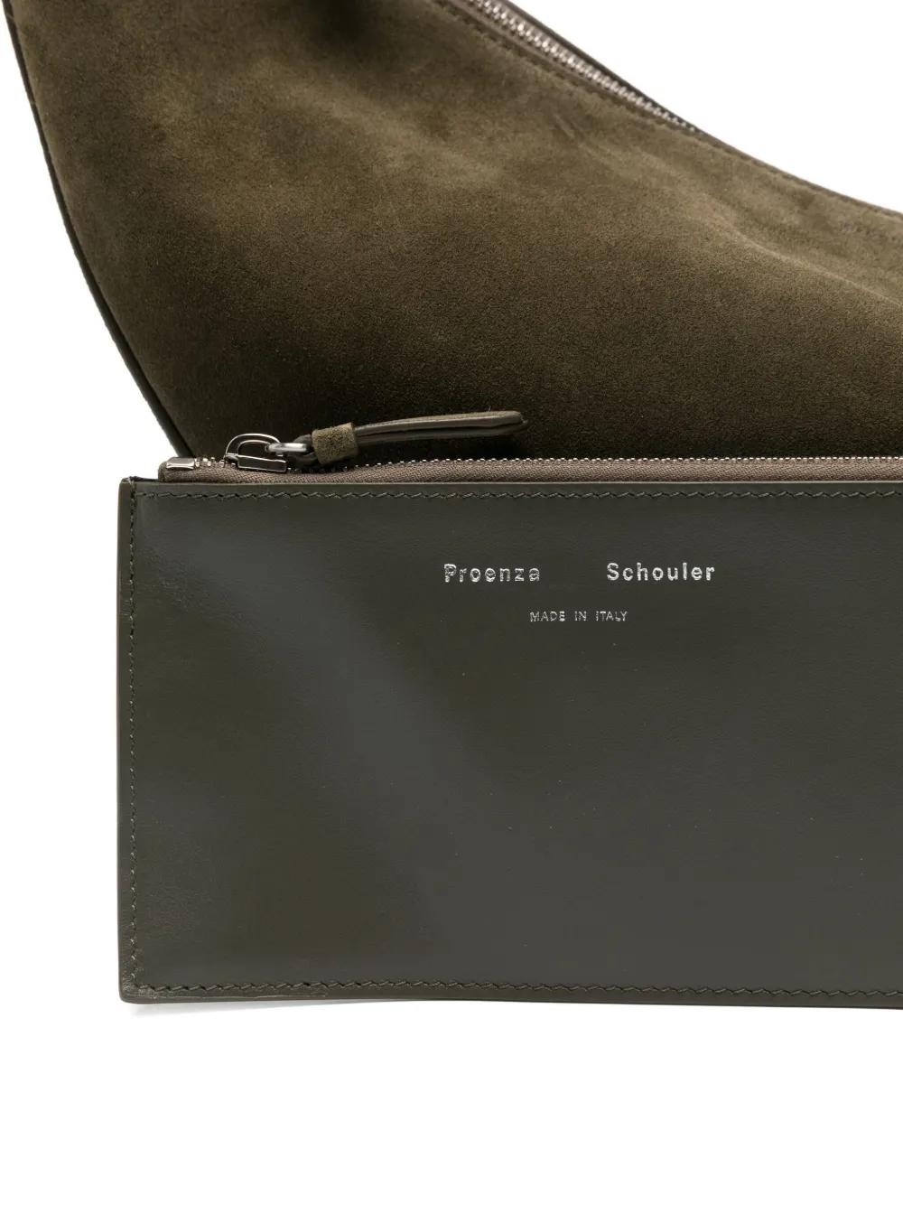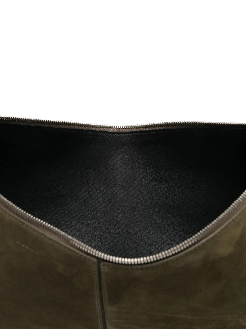 olive green suede zip fastening adjustable shoulder strap crescent shape