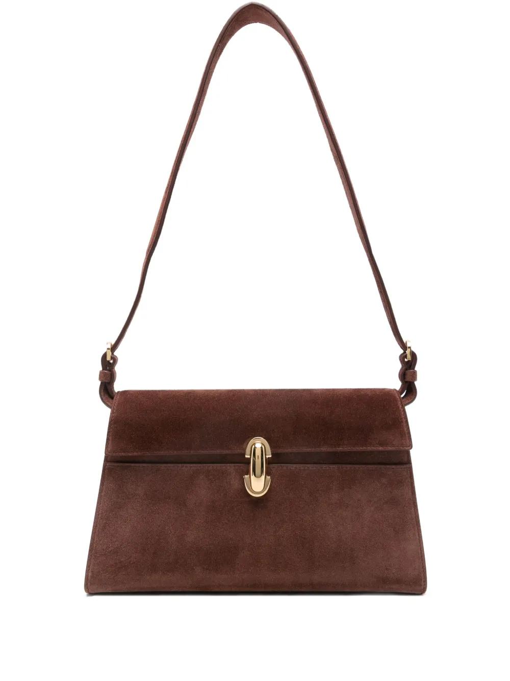 dark brown suede texture top handle gold-tone clasp rectangular shape flap closure
