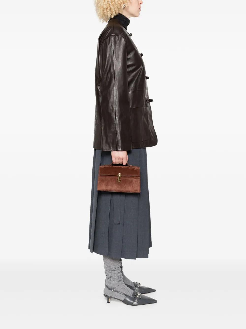 brown suede texture top handle gold-tone clasp rectangular shape internal slip pocket