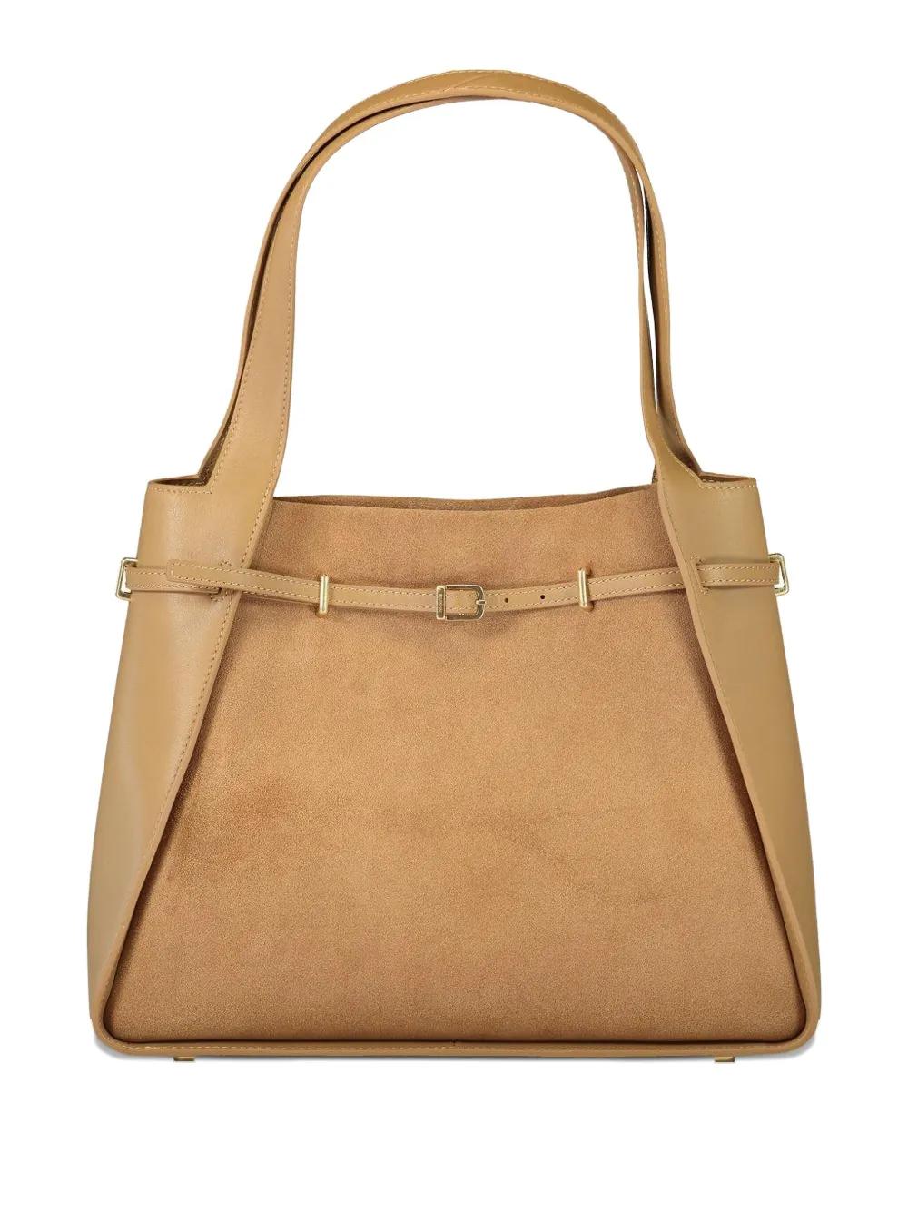 beiges suede buckled strap top handle gold-tone hardware bar detail