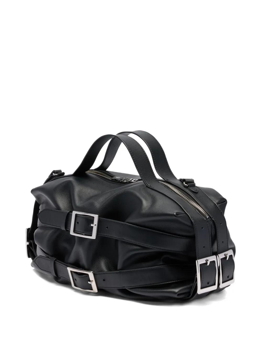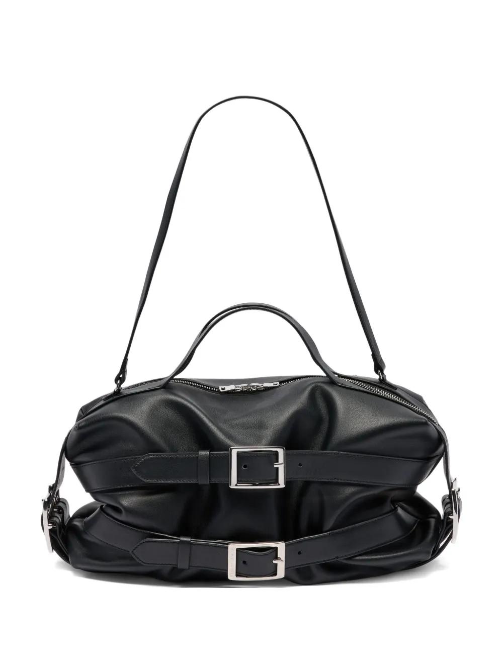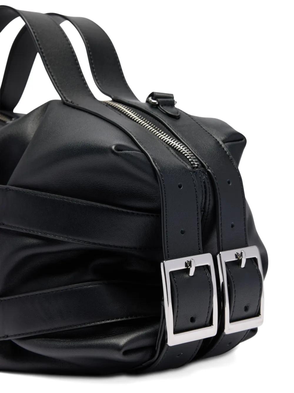 black leather double buckle detailing top handles zip closure slouchy silhouette