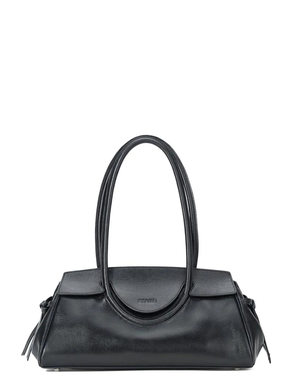 black calf leather two top handles top zip fastening logo print to the front logo tag adjustable detachable shoulder strap silver-tone hardware main compartment rectangle shape