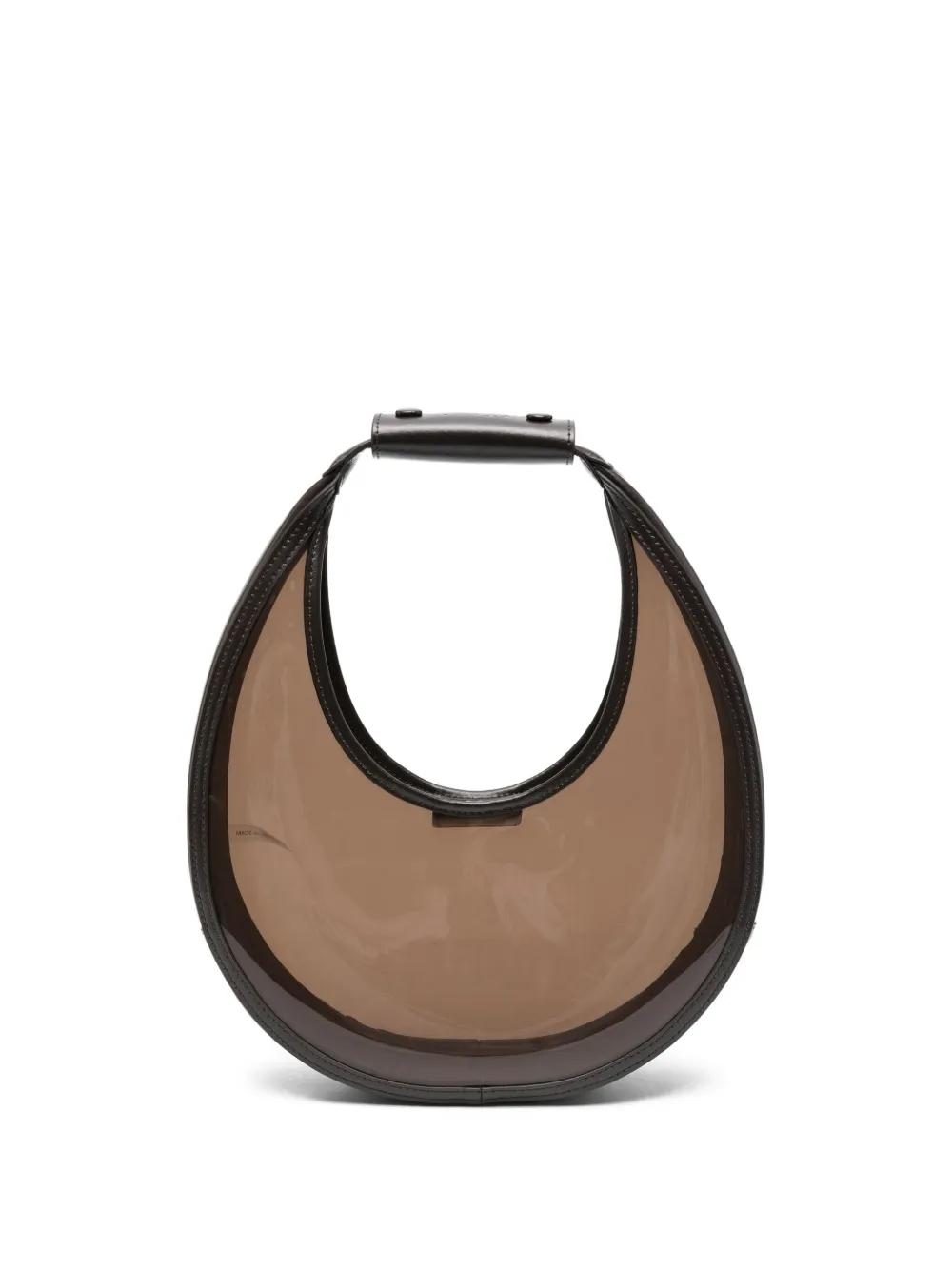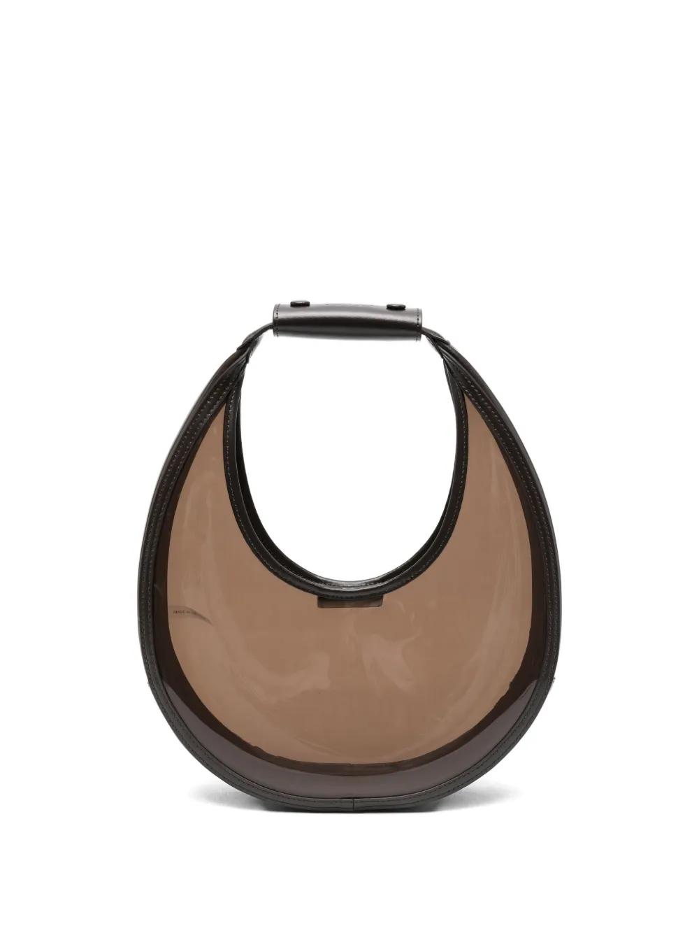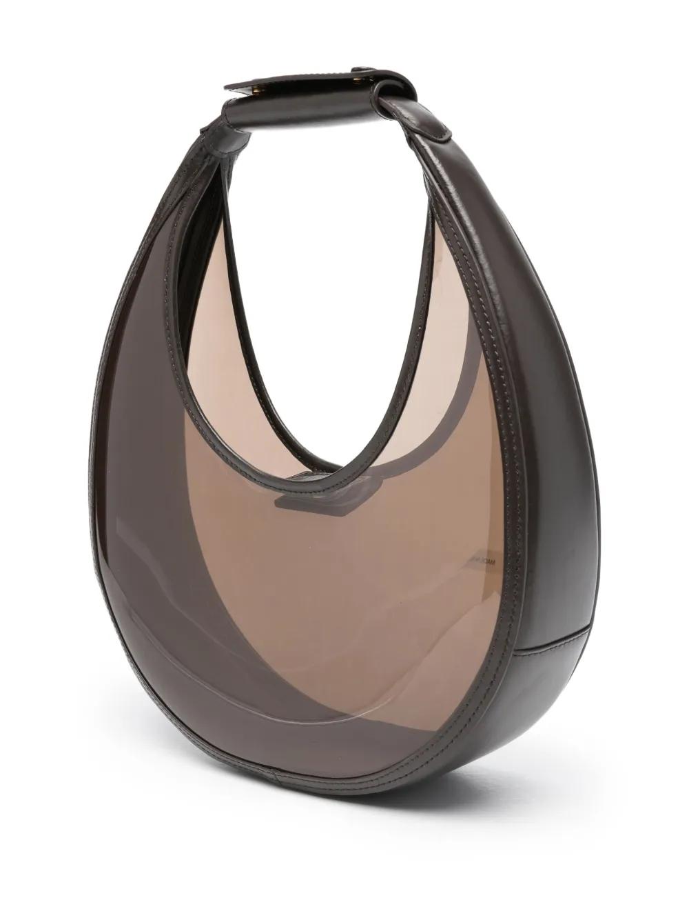 dark brown half-moon shape leather handle magnetic fastening logo debossed translucent panel