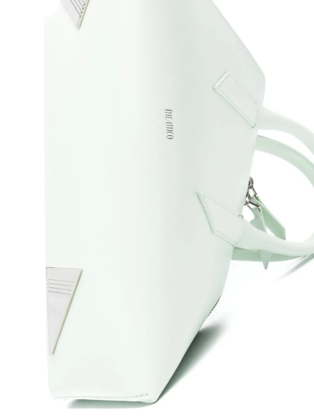 pastel green calf leather logo stamp to the front all-around zip fastening two rolled top handles adjustable detachable shoulder strap triangle-shaped metal feet leather lining debossed internal logo internal card slot main compartment silver-tone hardware This piece comes complete with a protective dust bag.