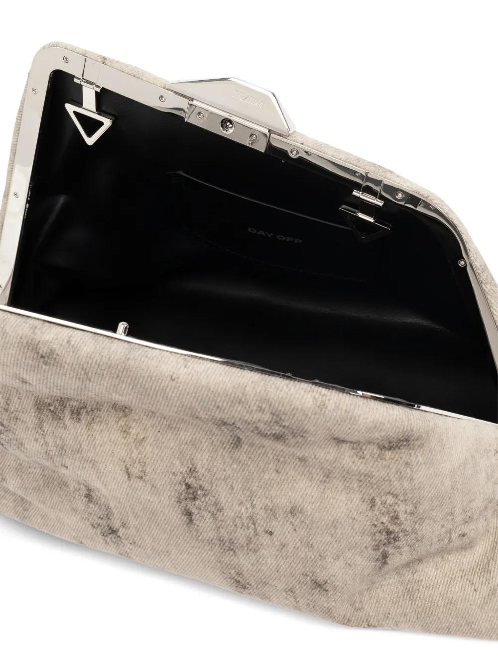 sand beige cotton blend trapezoidal silhouette rounded corners silver-tone metallic zipper main compartment slip pocket