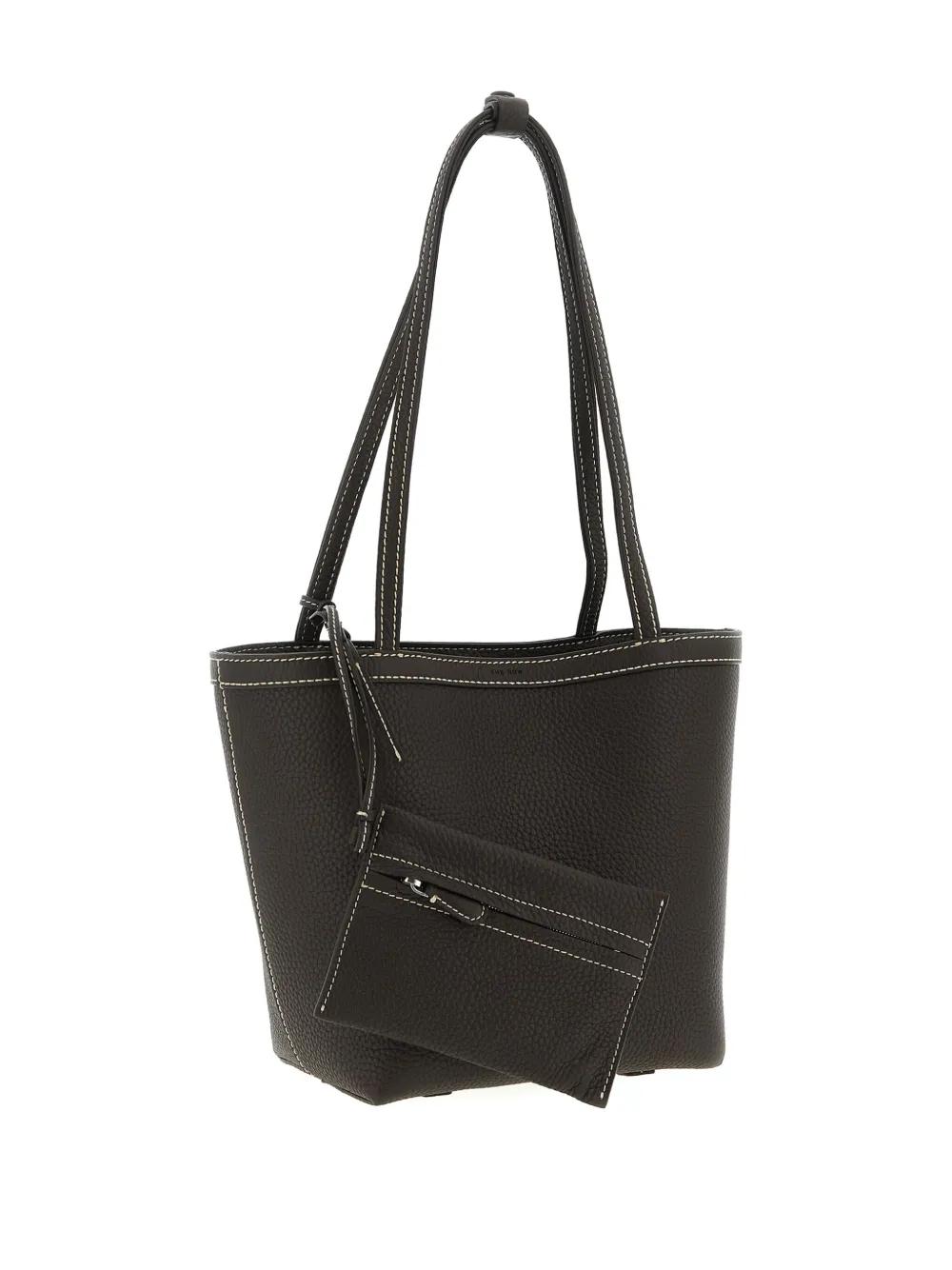 brown grained calf leather contrast stitching double fixed handle inner drawstring-fastening removable clutch rigid base feet