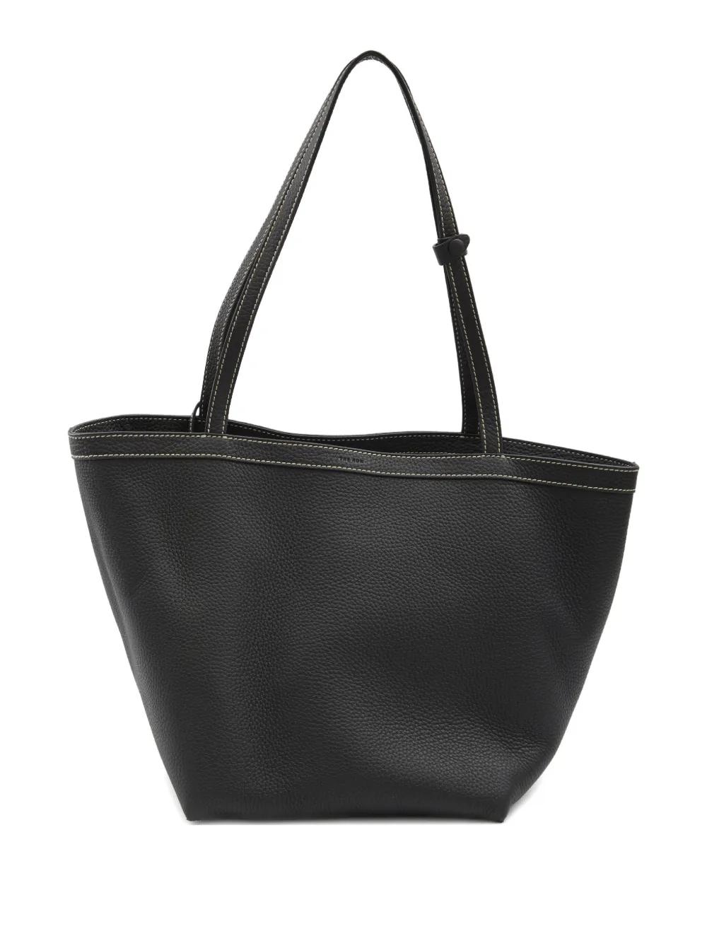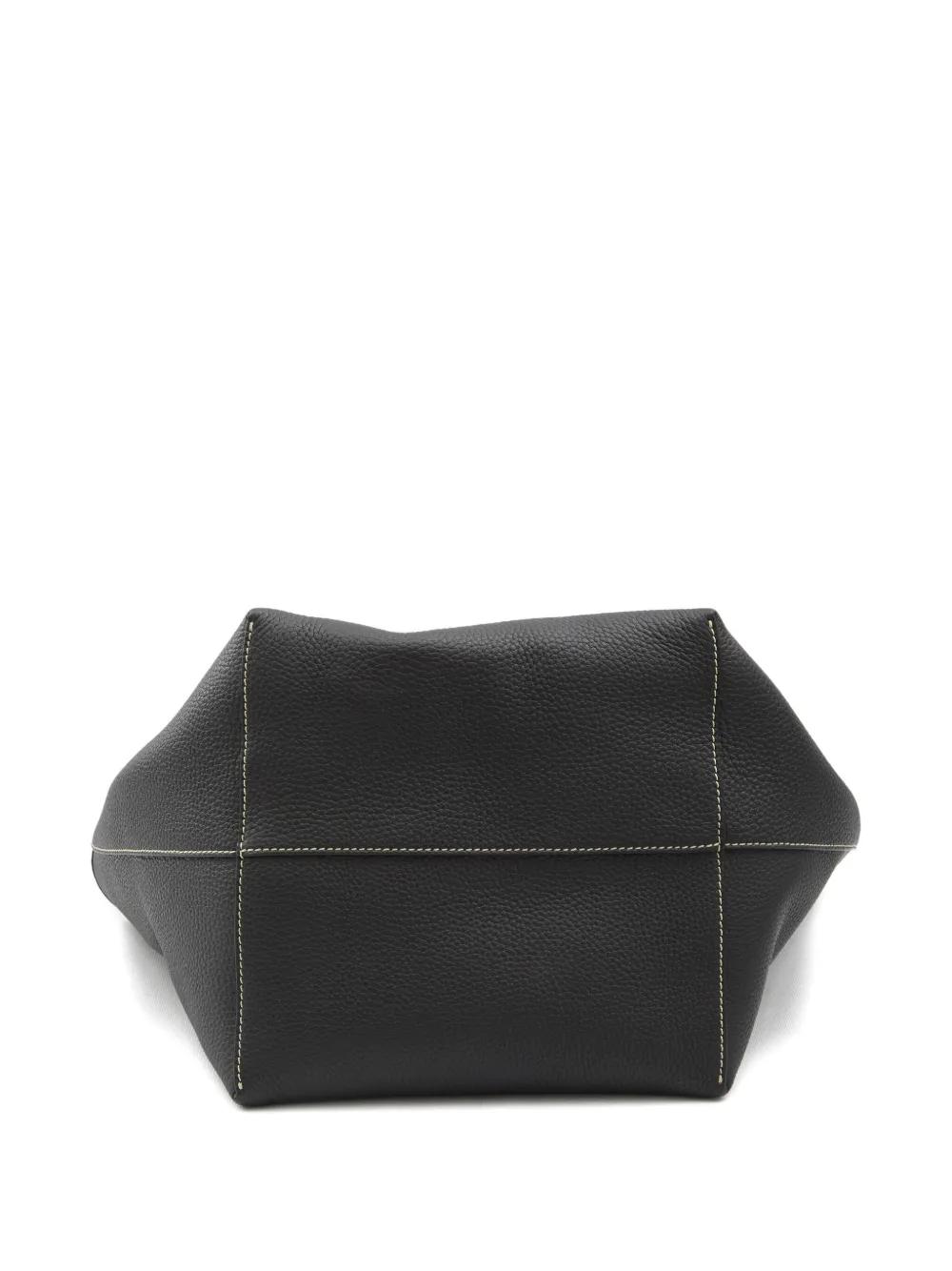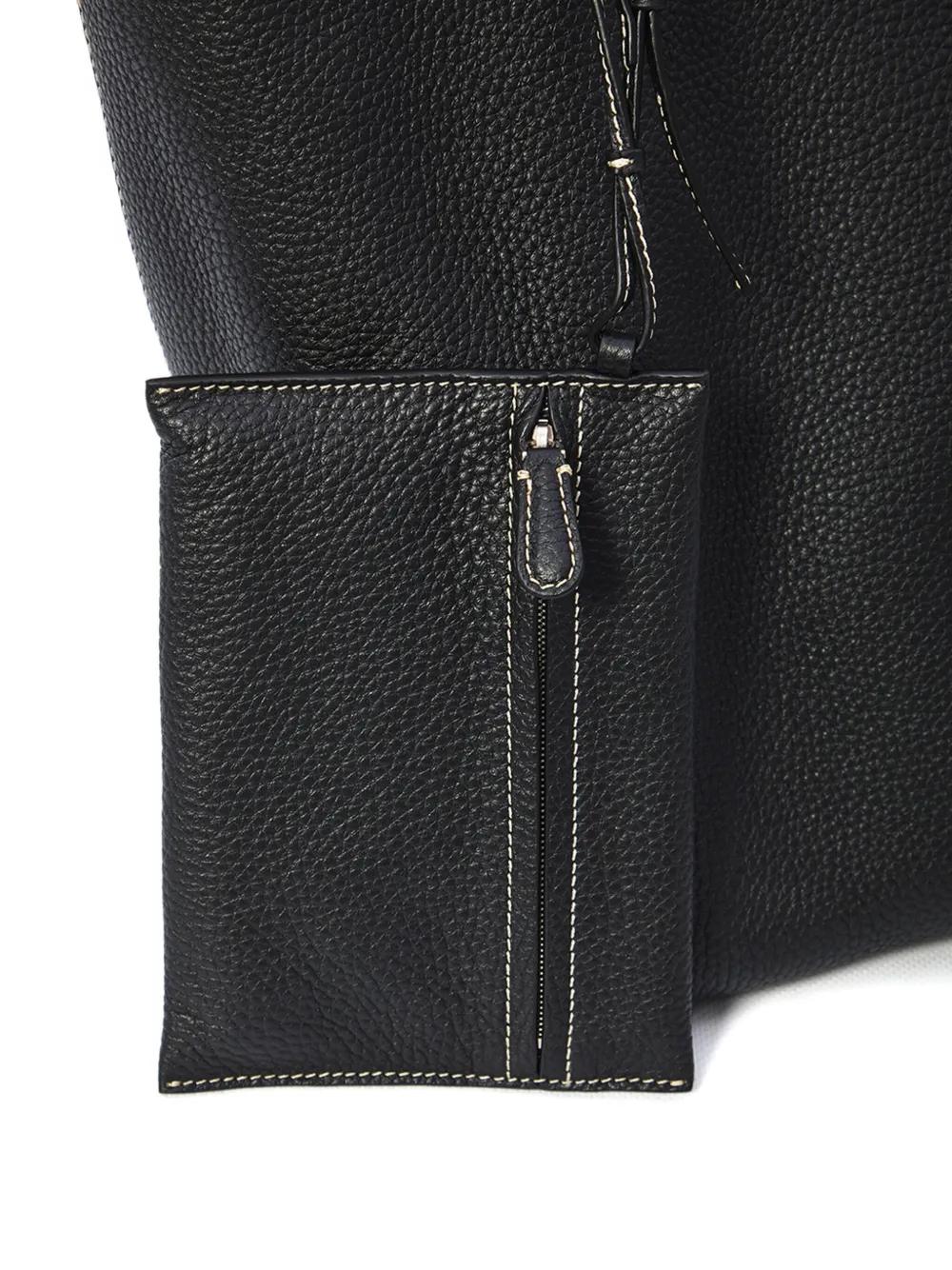 black grained calfskin leather contrasting topstitching two top handles internal tie closure inner pouch with adjustable strap