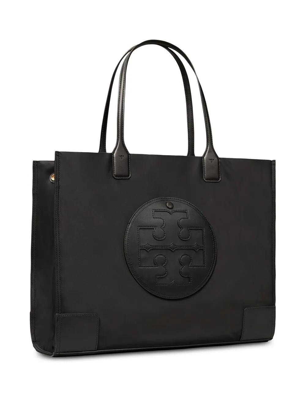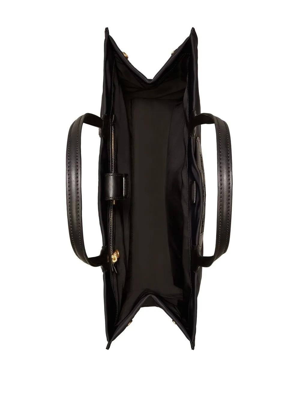 black recycled nylon/recycled polyester/artificial leather embossed logo to the front two top handles open top