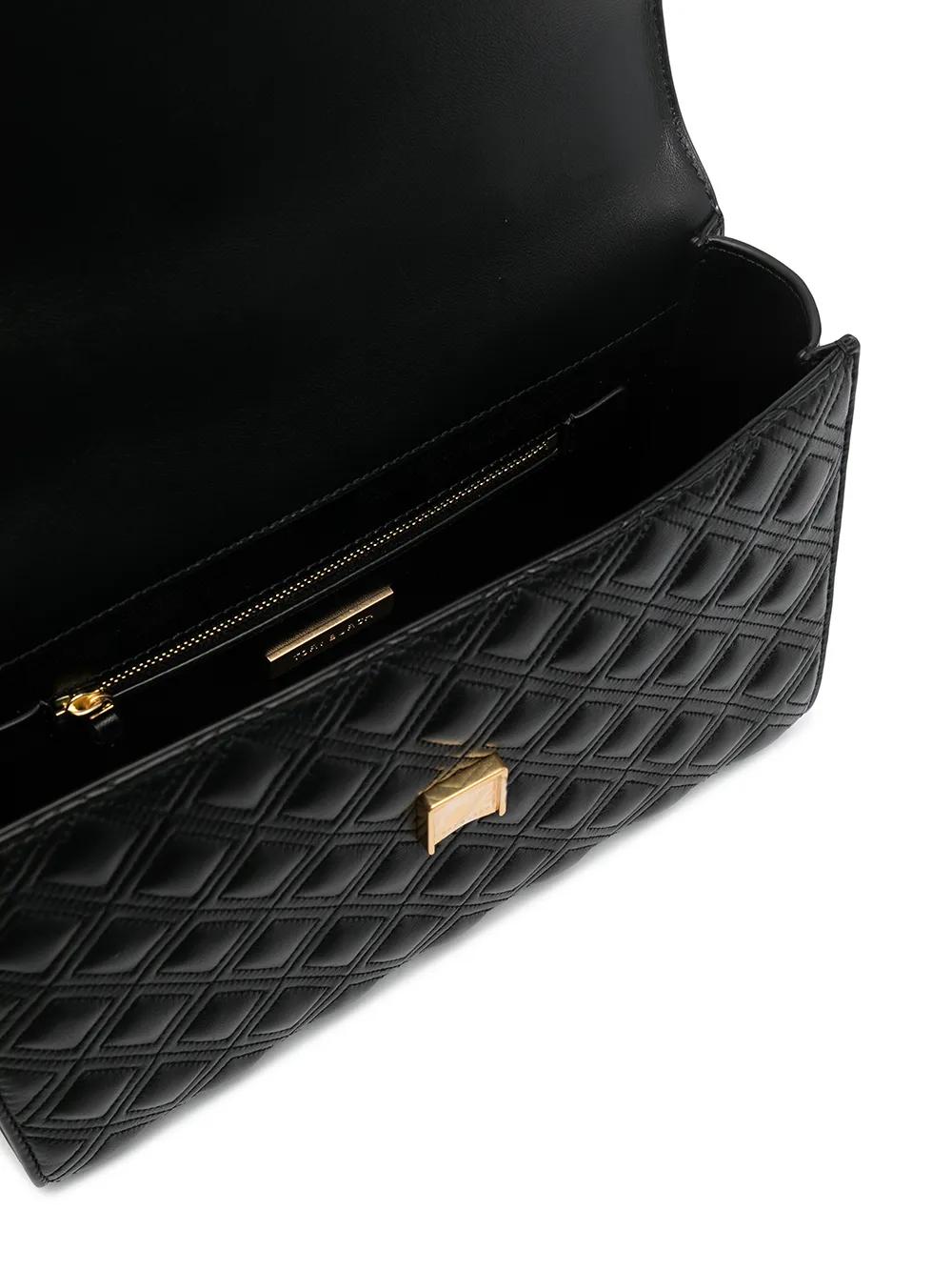 jet black calf leather smooth grain matelassé detailing embossed logo to the front tassel detail internal logo plaque foldover top magnetic fastening adjustable leather and chain-link shoulder strap main compartment internal zip-fastening pocket slip pocket to the rear