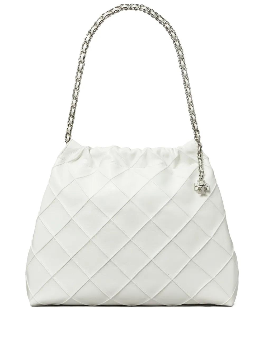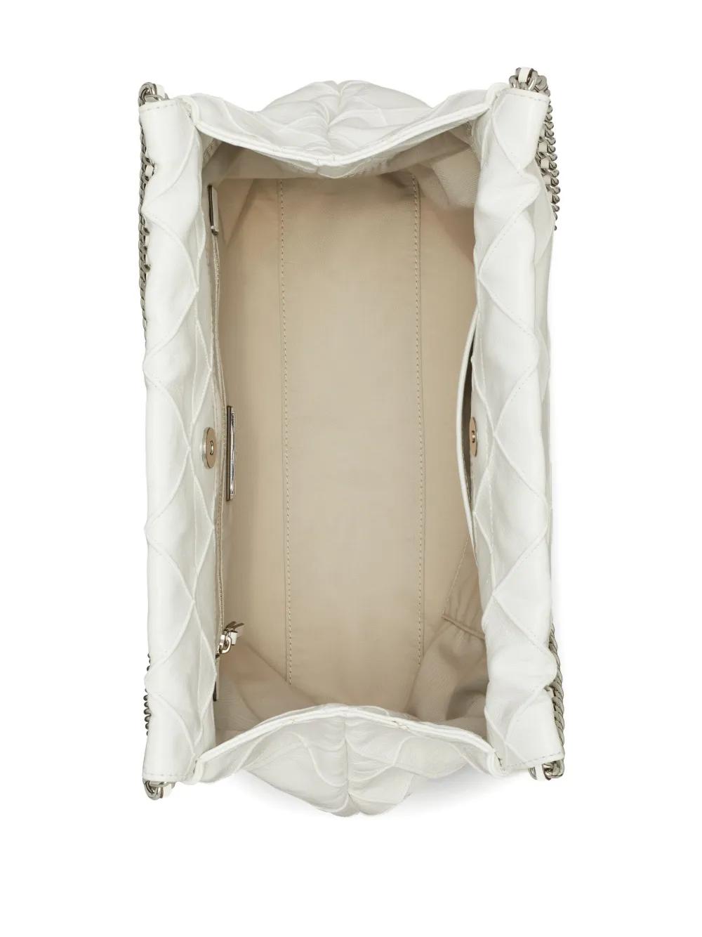 white leather quilted diamond pattern chain-link shoulder straps logo charm