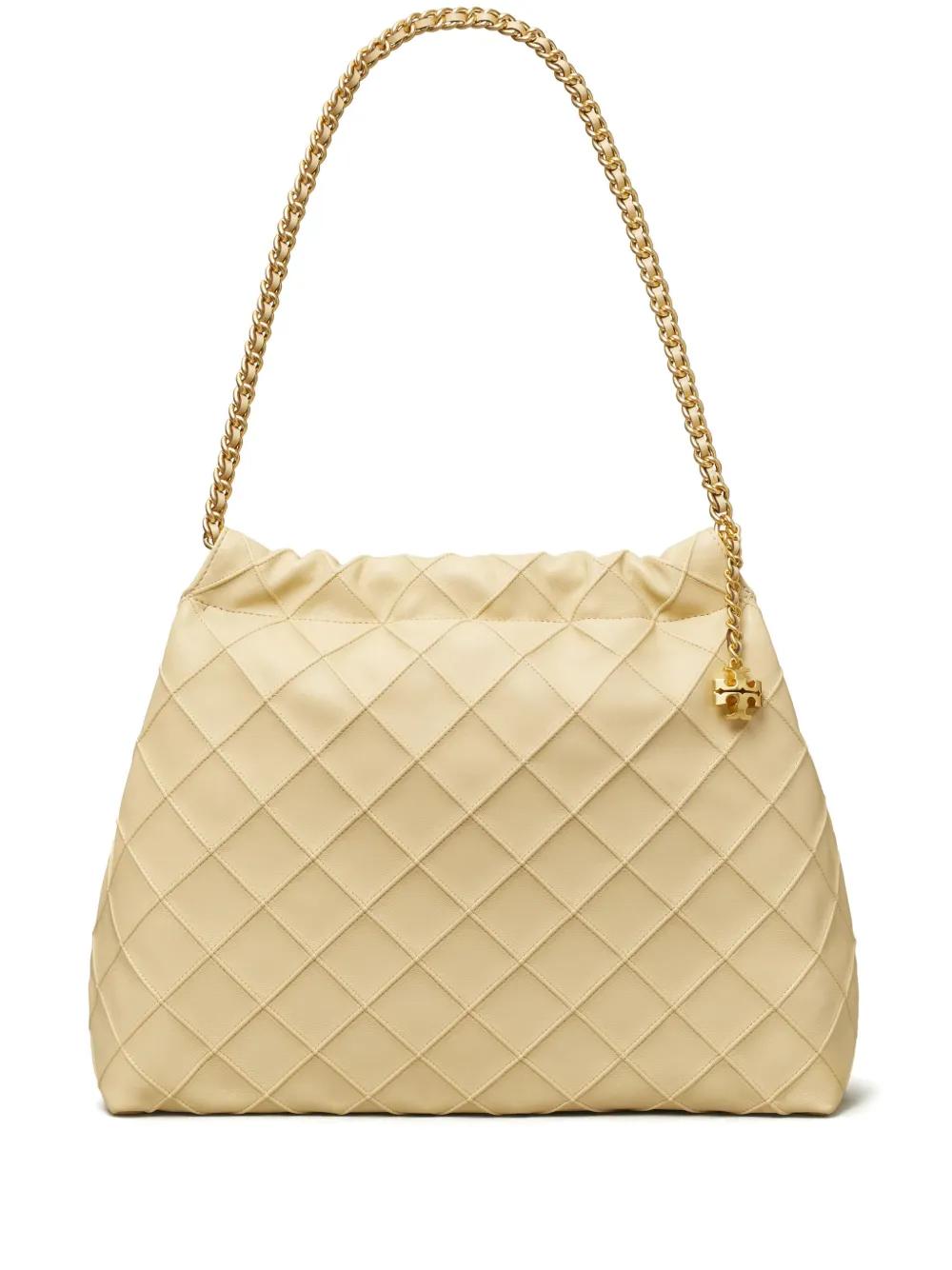 yellow leather diamond pattern drawstring fastening magnetic fastening two chain-link top handles chain-link shoulder strap logo charm main compartment internal logo plaque