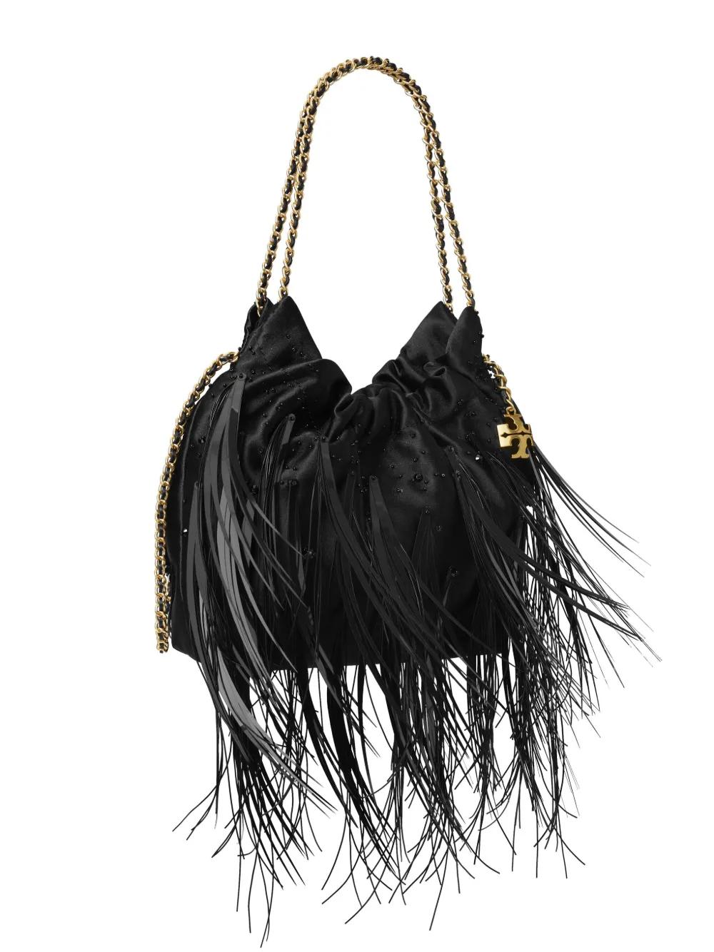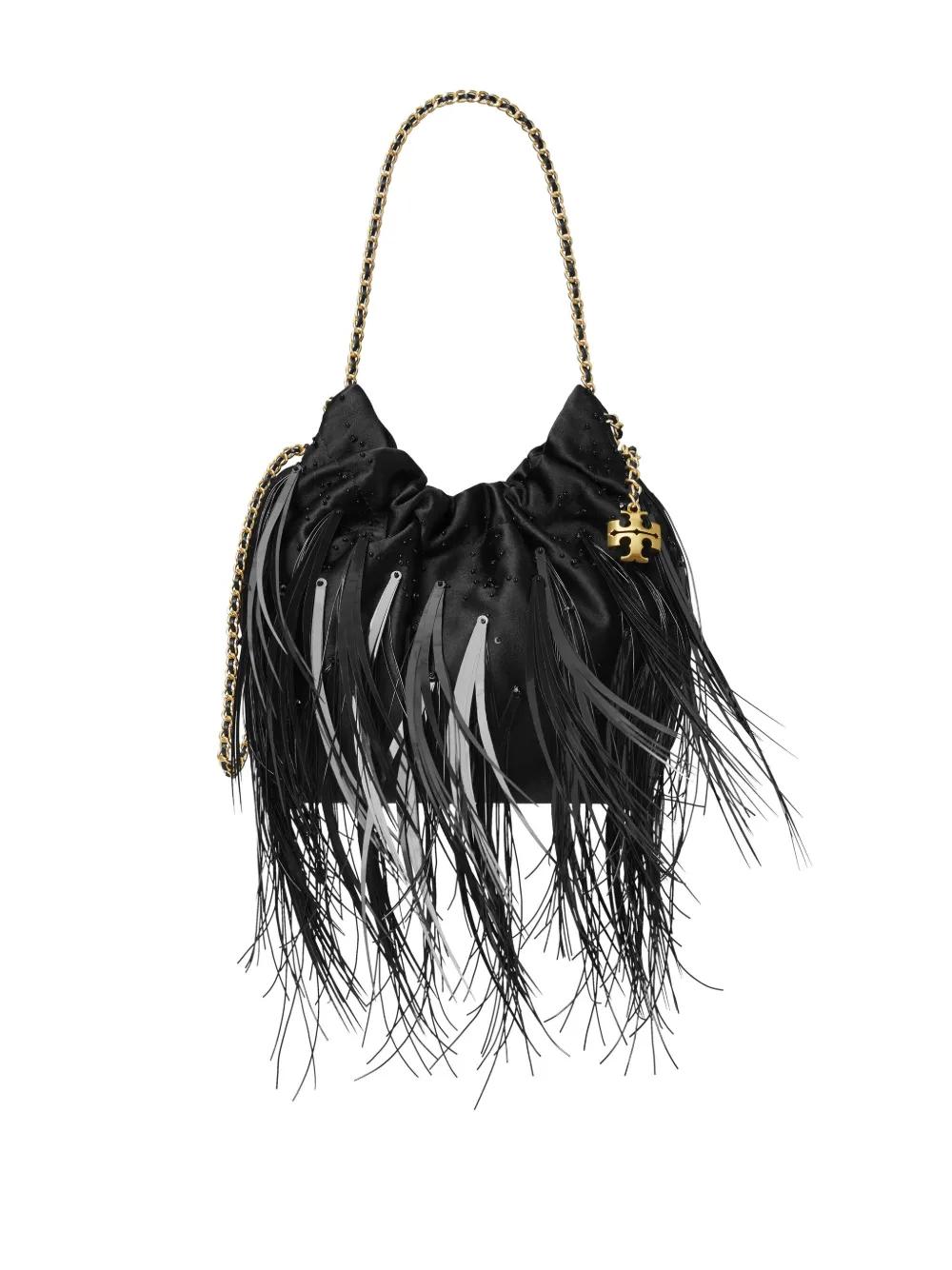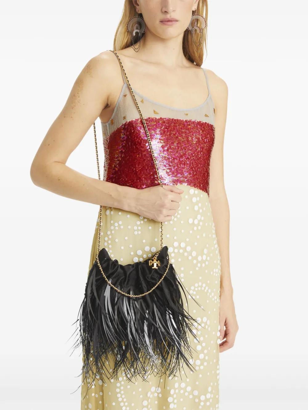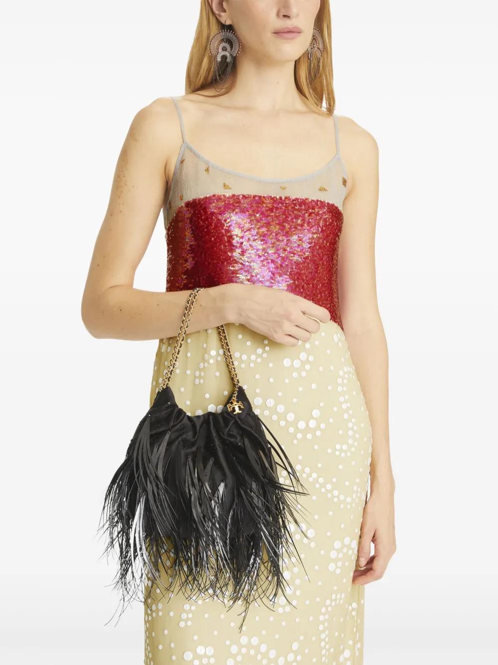 black nappa leather diamond pattern bead embellishment sequin embellishment drawstring fastening magnetic fastening single chain-link top handle chain-link shoulder strap feather detailing logo charm main compartment internal logo plaque