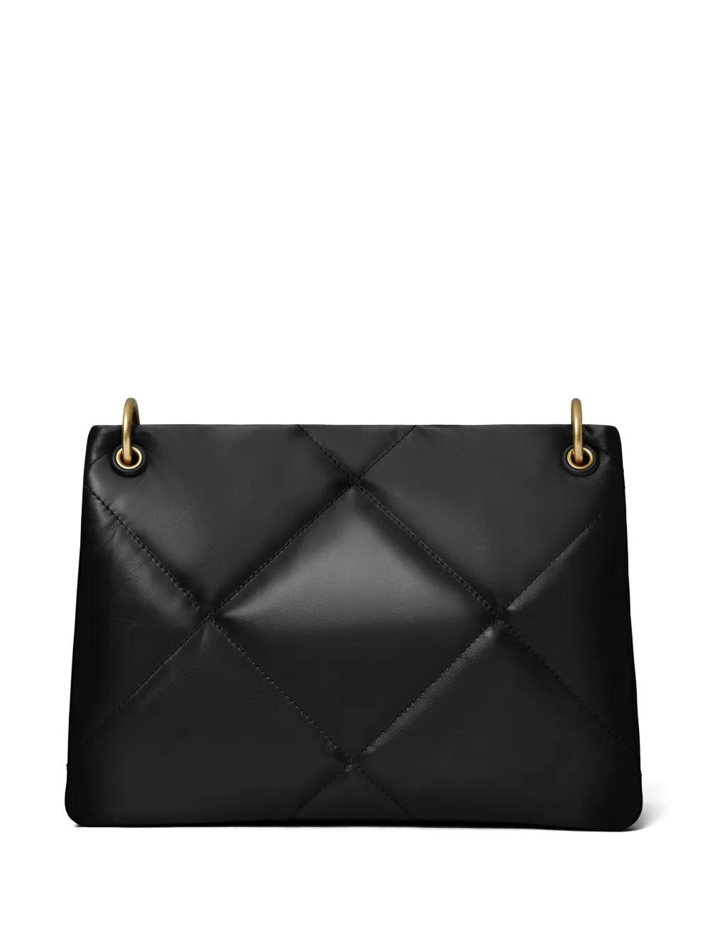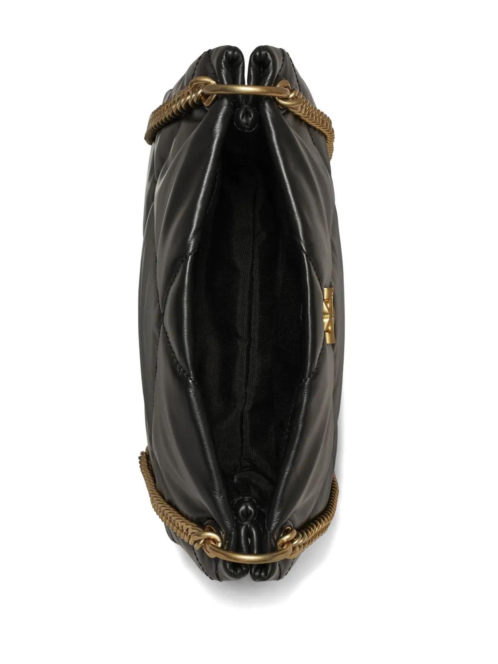 black leather quilted magnetic fastening chain-link shoulder strap gold-tone logo plaque main compartment