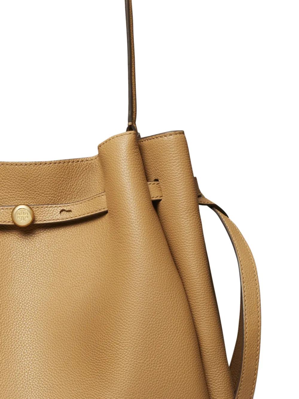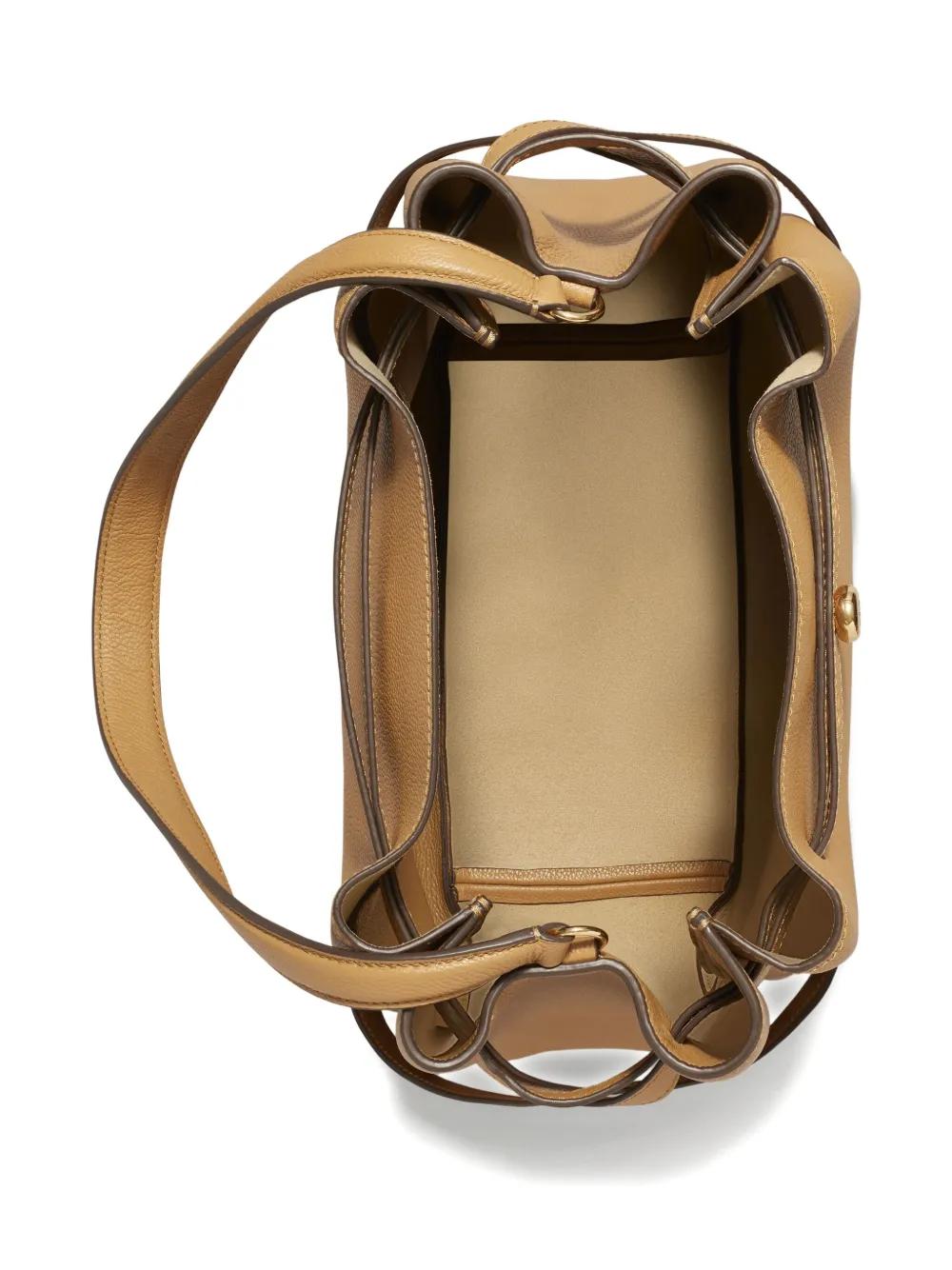 light brown grained texture top handle shoulder strap button detail drawstring fastening