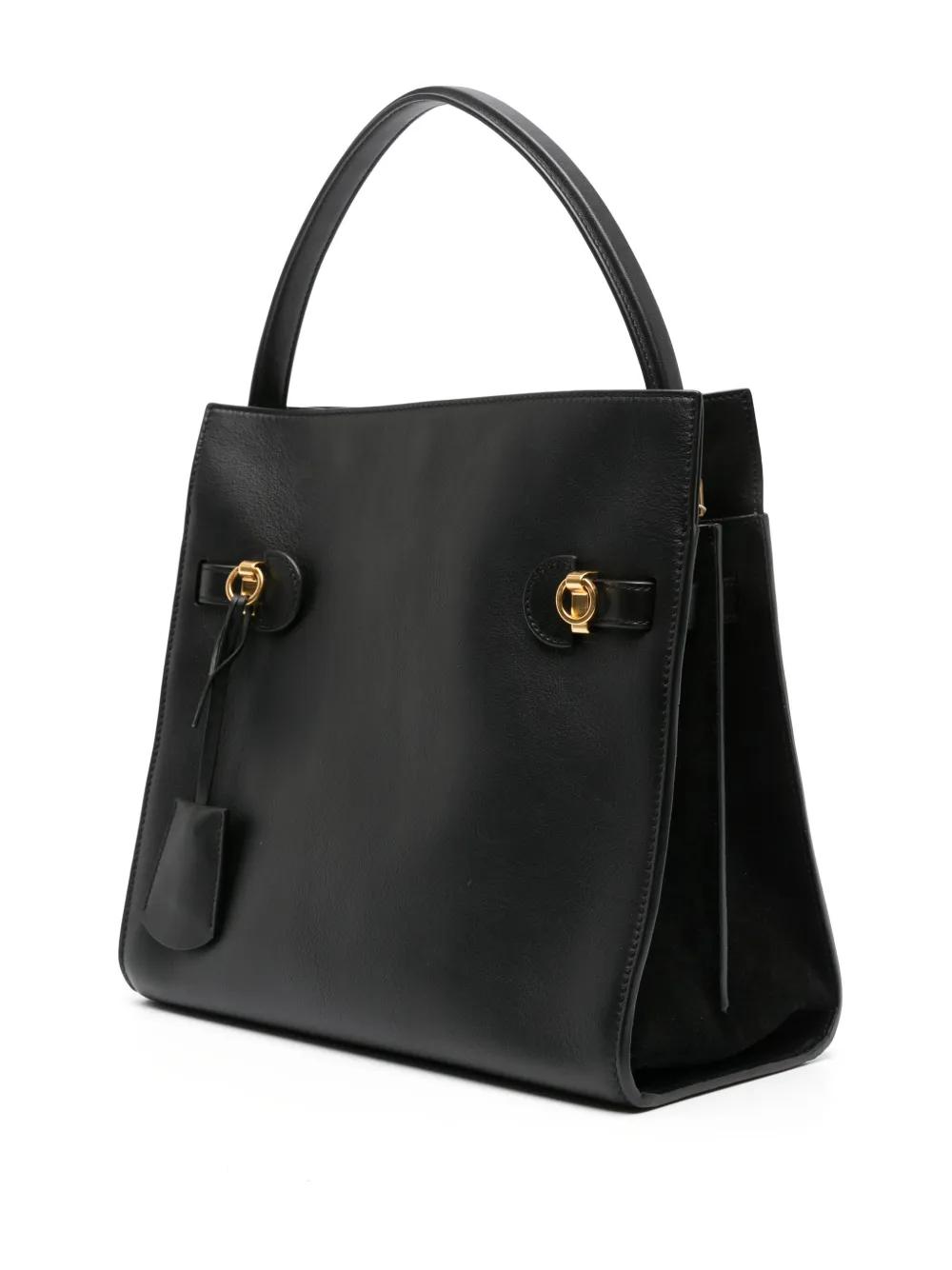 black calf leather grained texture hanging key fob concealed press-stud fastening single top handle adjustable detachable shoulder strap partitioned compartment internal logo stamp internal zip-fastening pocket metal feet suede lining gold-tone hardware