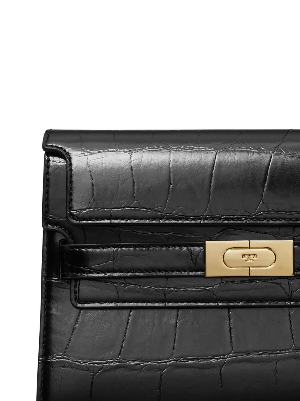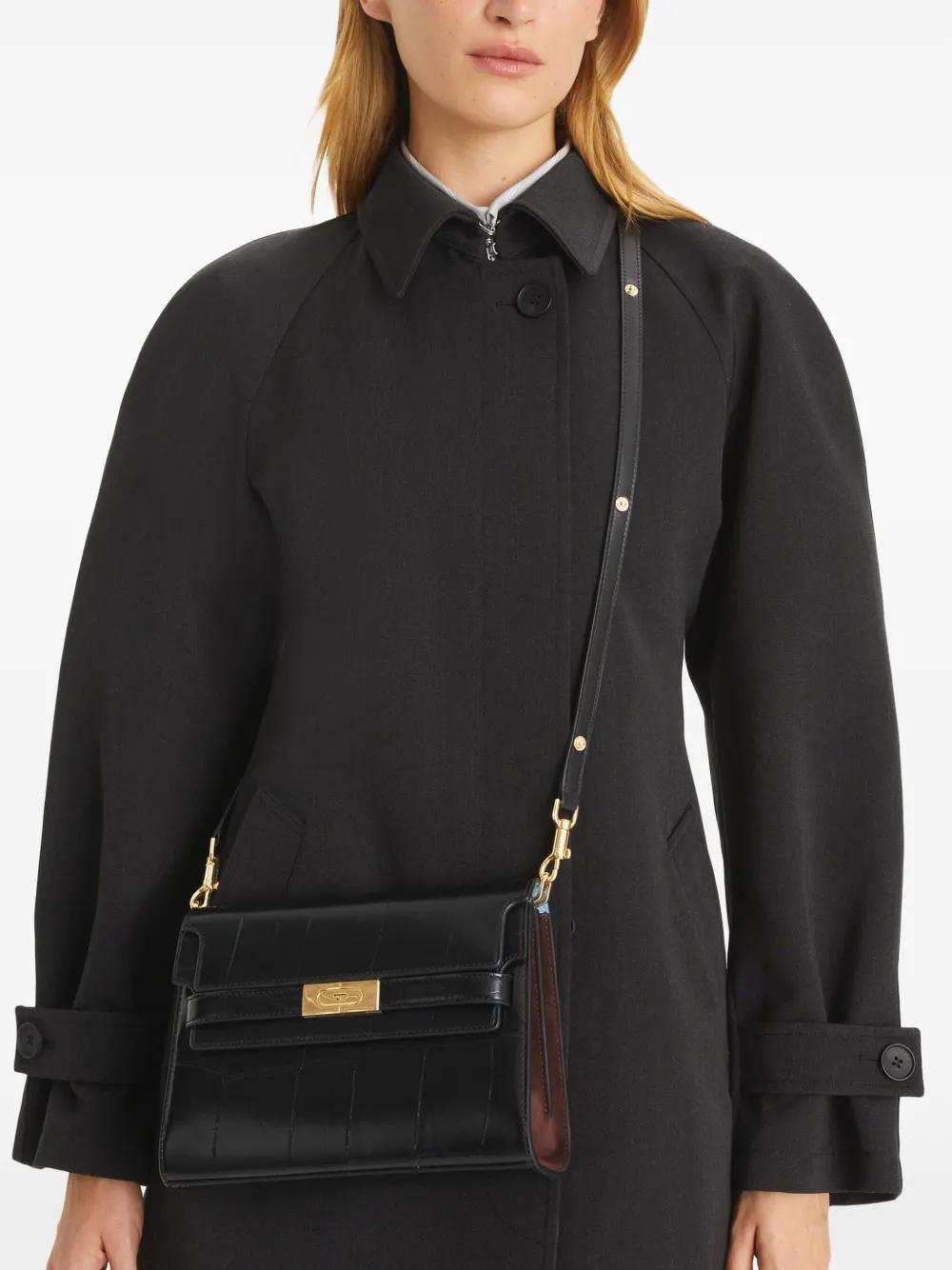 black leather foldover top with magnetic fastening adjustable detachable shoulder strap embossed crocodile effect logo-engraved gold-tone hardware partitioned compartment full lining internal zip-fastening pocket