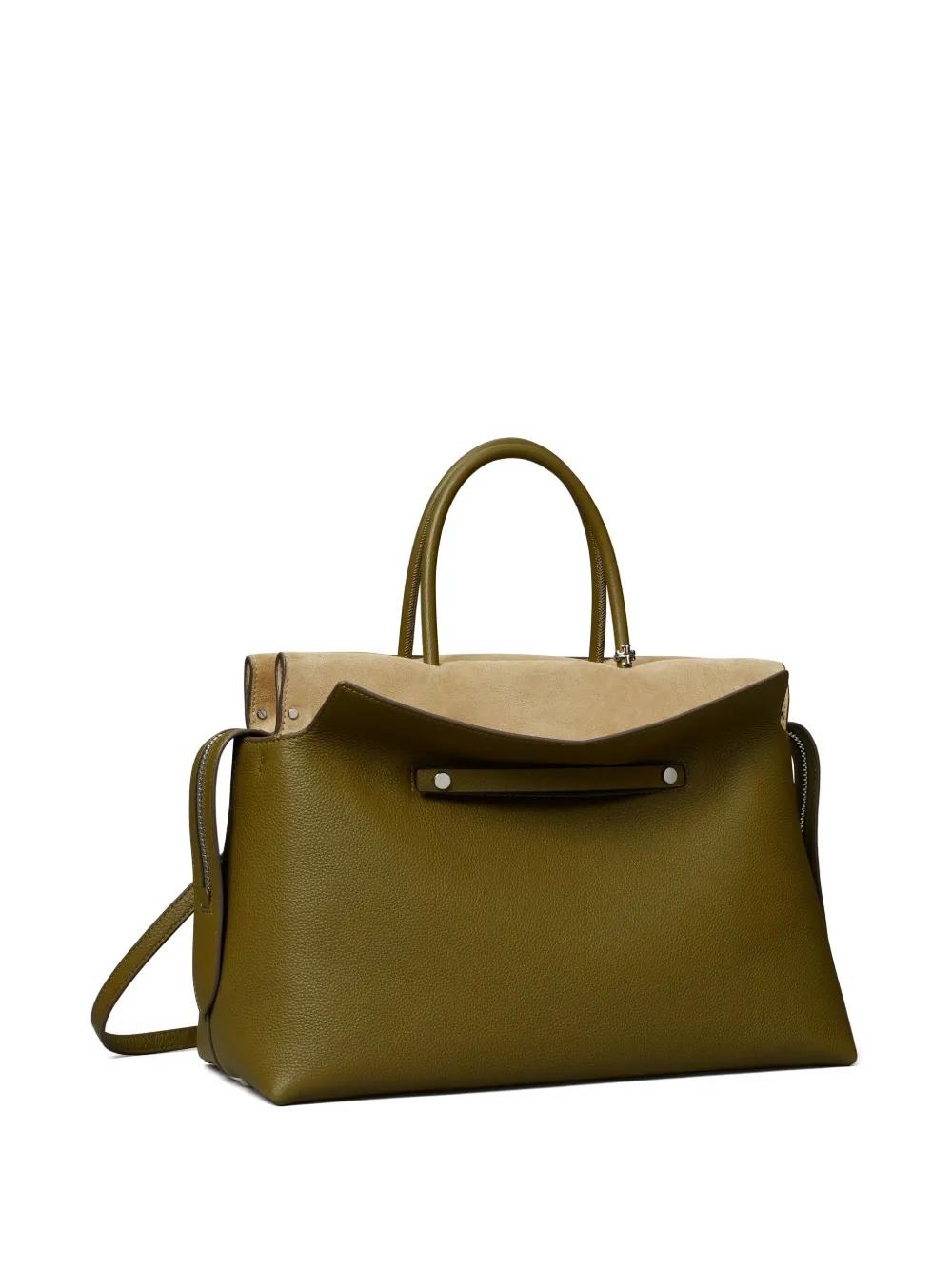 olive green top zip fastening two rolled top handles adjustable detachable shoulder strap main compartment