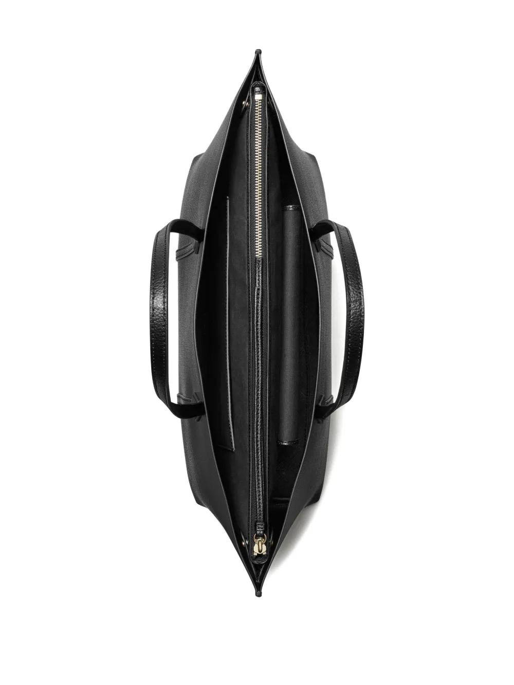 black embossed logo detail dual shoulder straps open top design structured silhouette