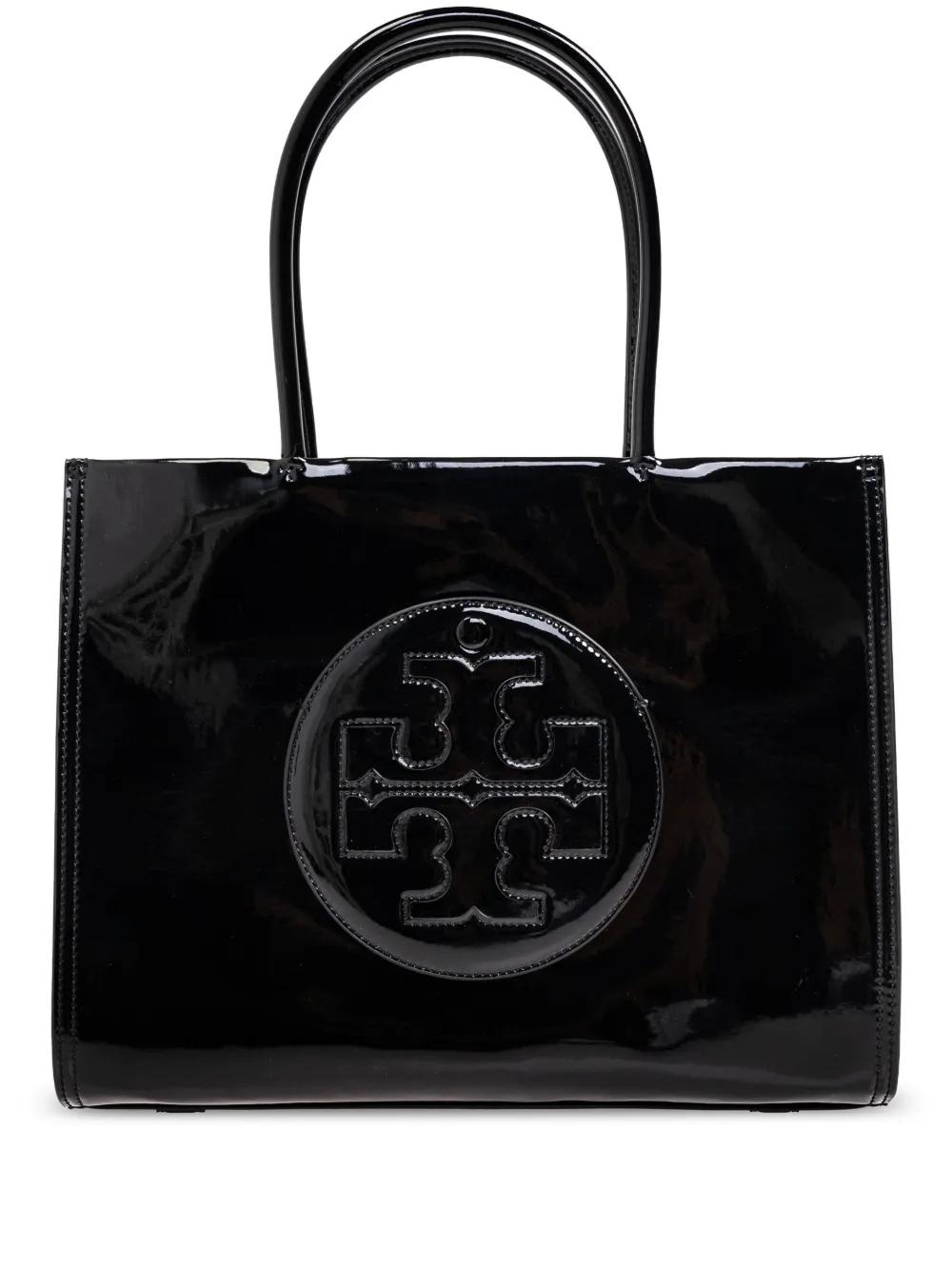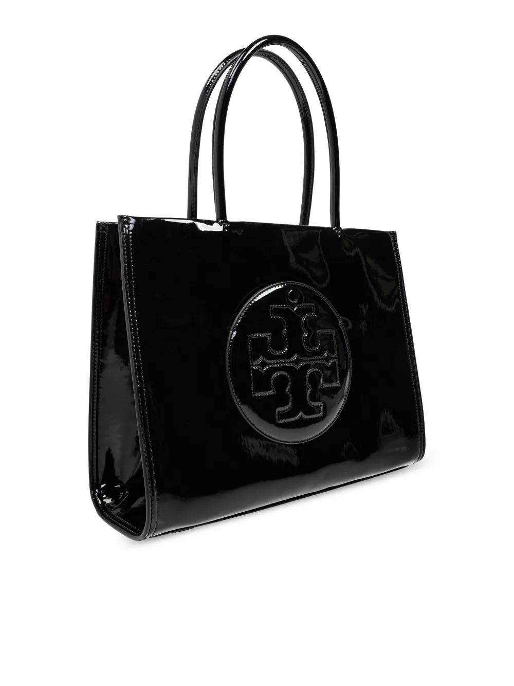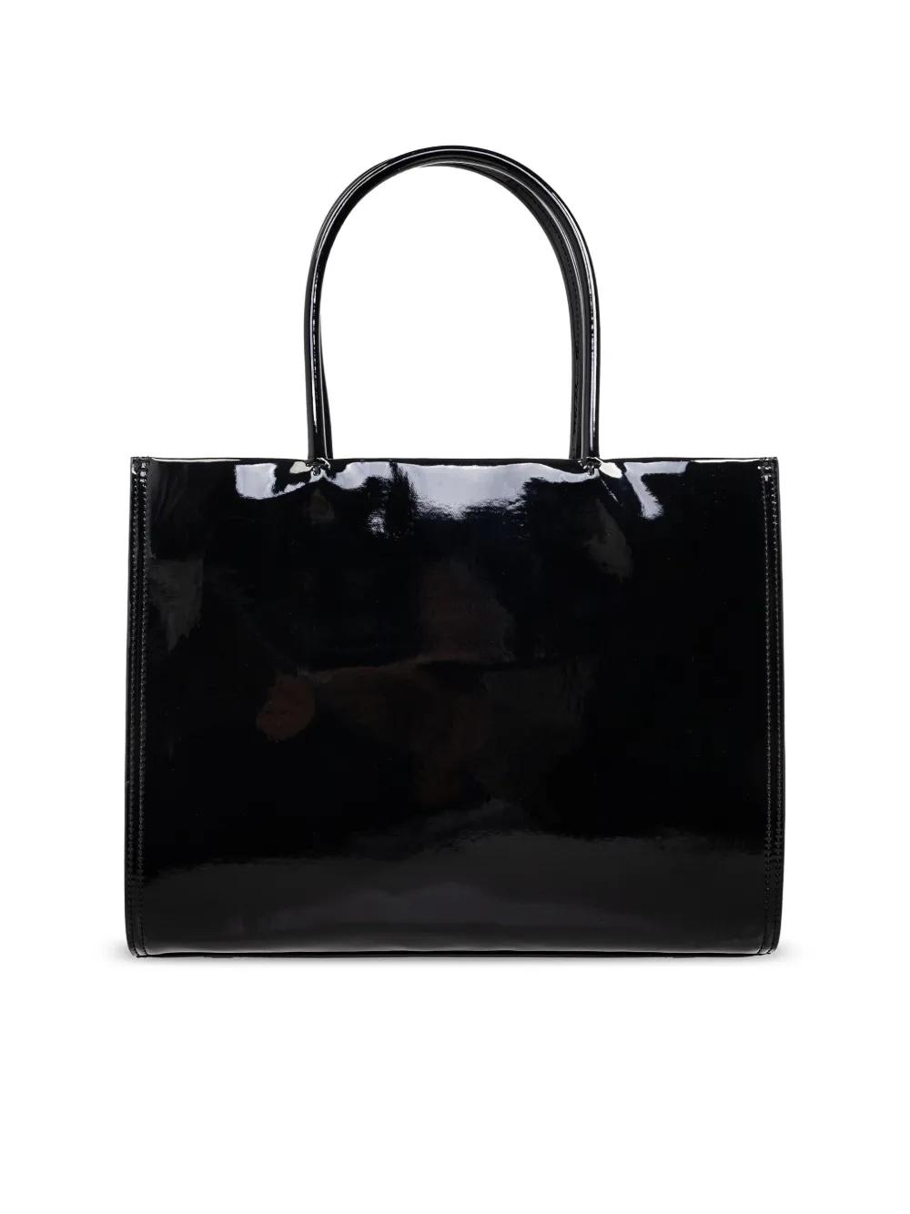 black faux leather patent finish magnetic fastening two top handles adjustable shoulder strap logo patch to the front main compartment internal zip-fastening pocket internal slip pocket