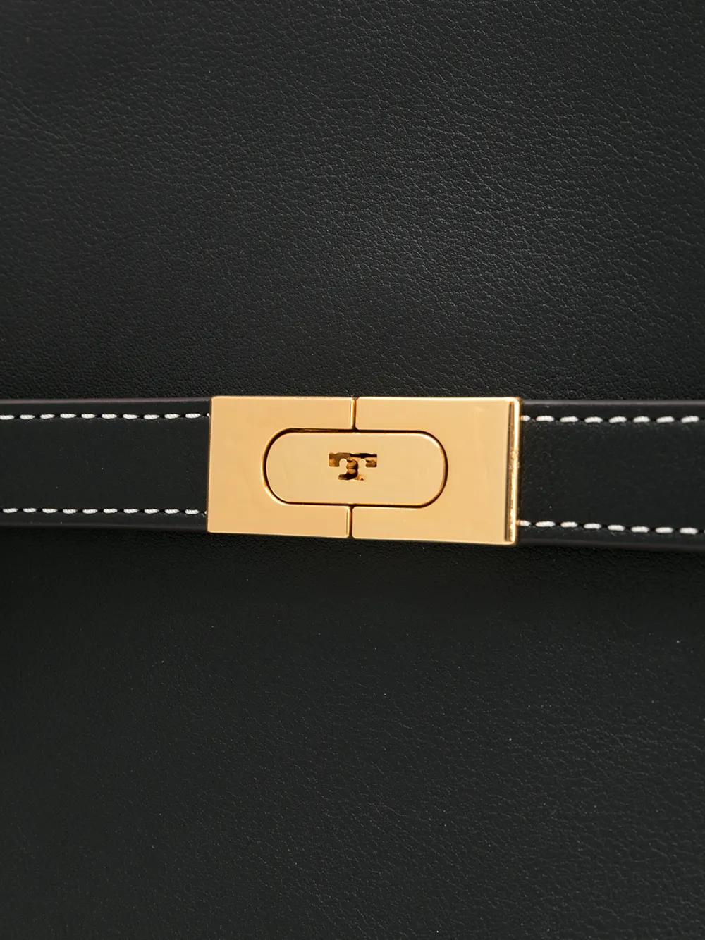 Grey/brown leather Lee Radziwill tote bag from TORY BURCH featuring contrast stitching, gold-tone hardware, turn-clasp fastening, adjustable detachable shoulder strap, single top handle, partitioned compartment and internal zip pocket.