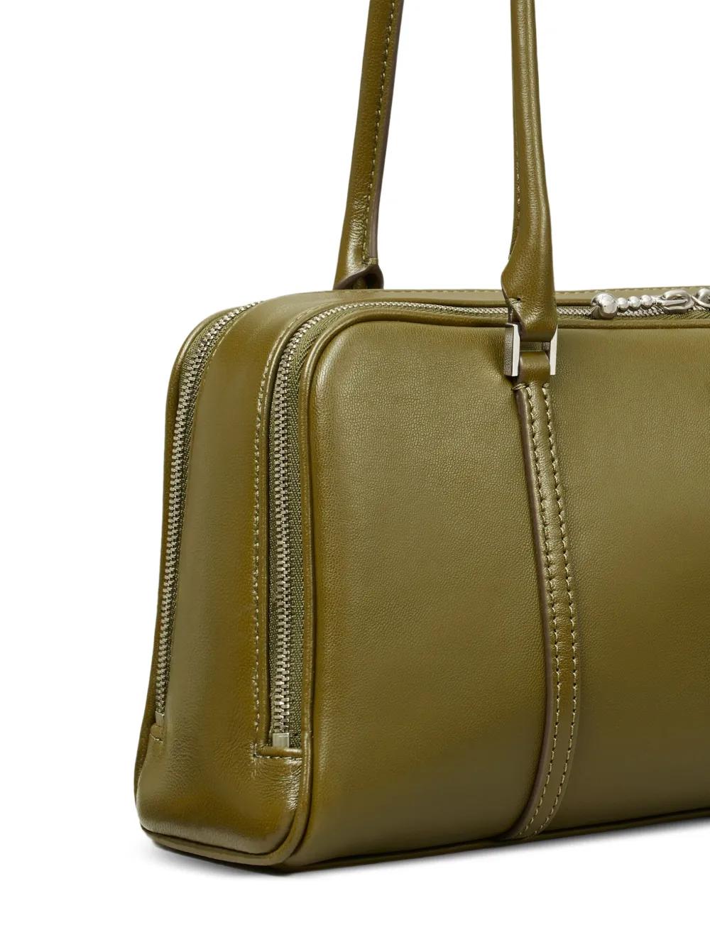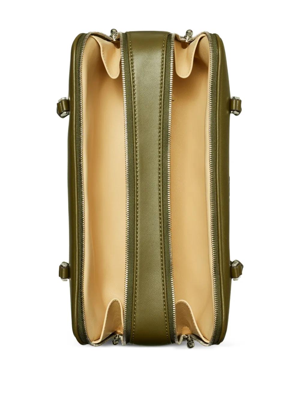 olive green top handle zip fastening double-zip closure embossed logo rectangular shape