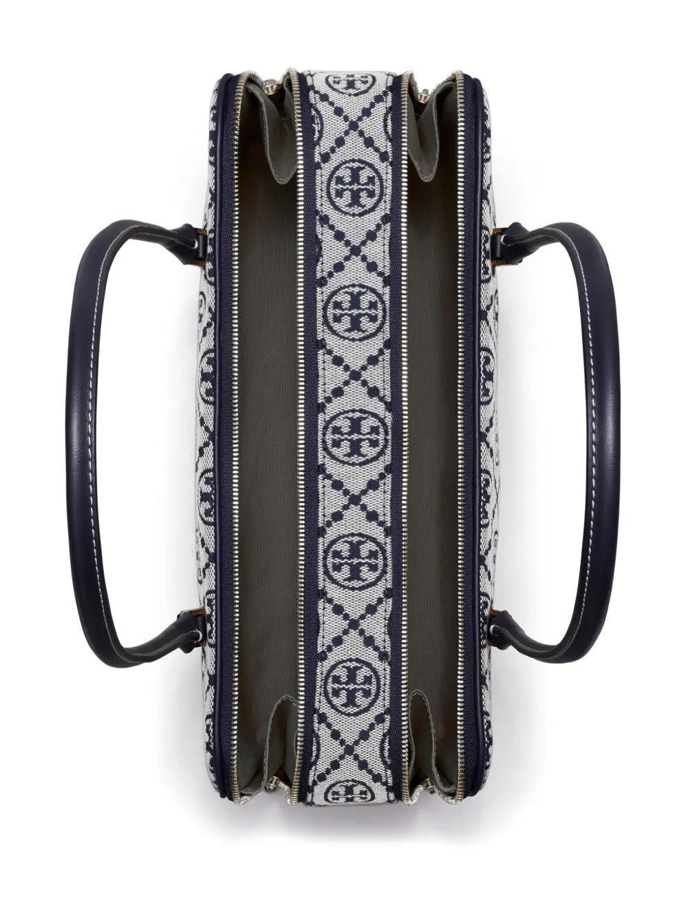 navy blue cotton blend two-way zip fastening two long top handles leather trim signature T Monogram pattern gold-tone hardware branded zip puller partitioned compartment full lining