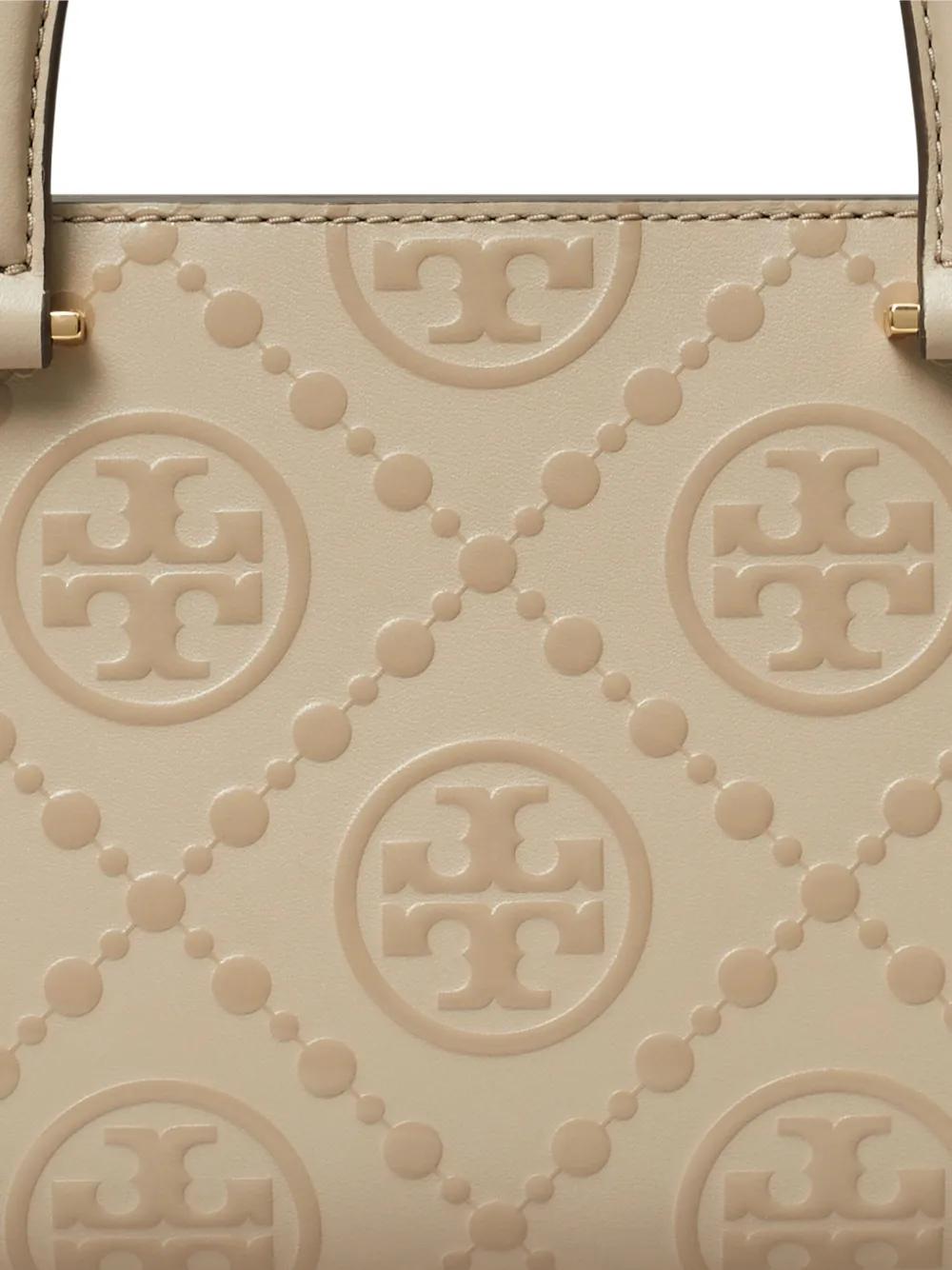 beige calf leather top zip fastening two top handles adjustable detachable shoulder strap signature T Monogram pattern gold-tone hardware main compartment