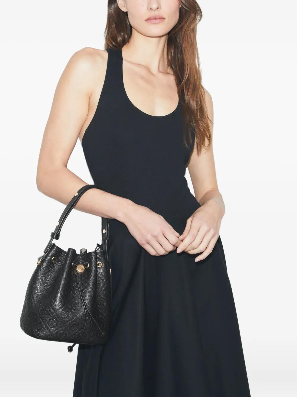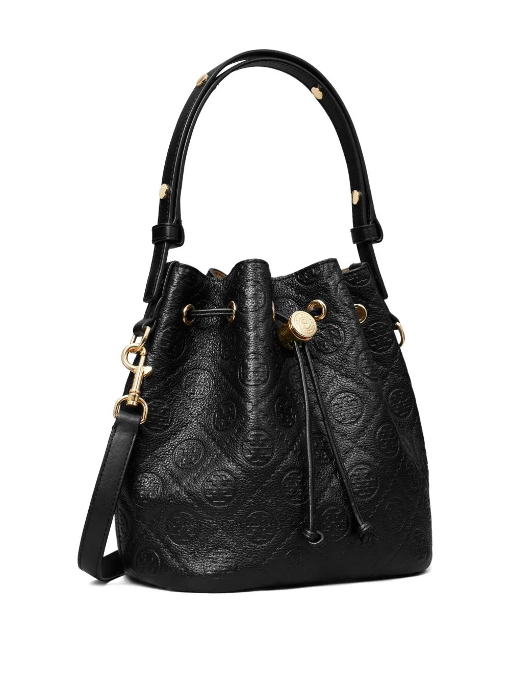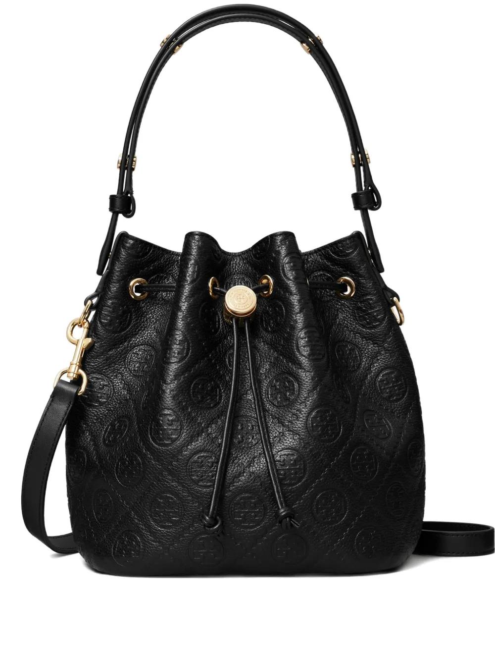 black embossed logo pattern drawstring closure detachable shoulder strap gold-tone hardware