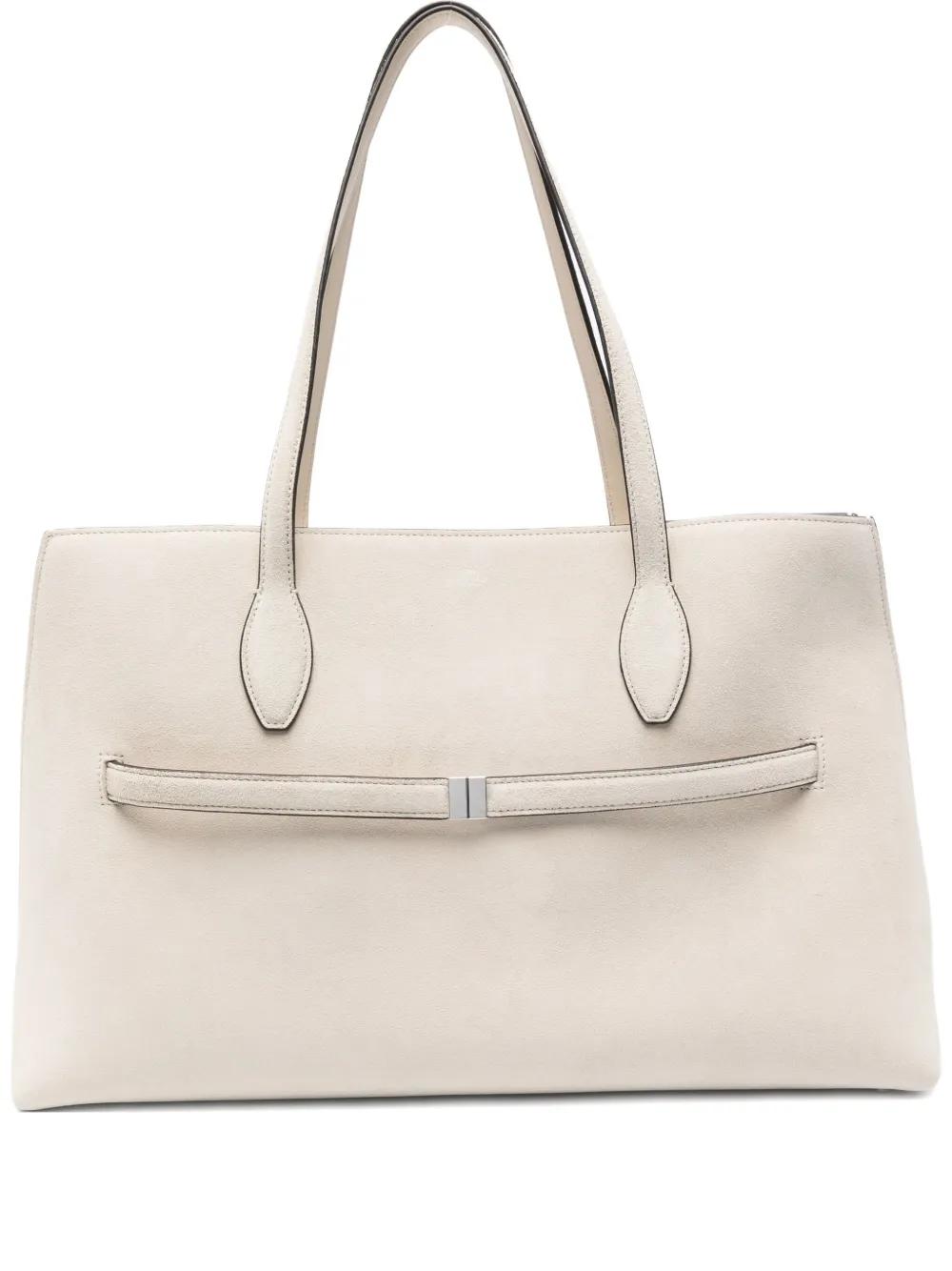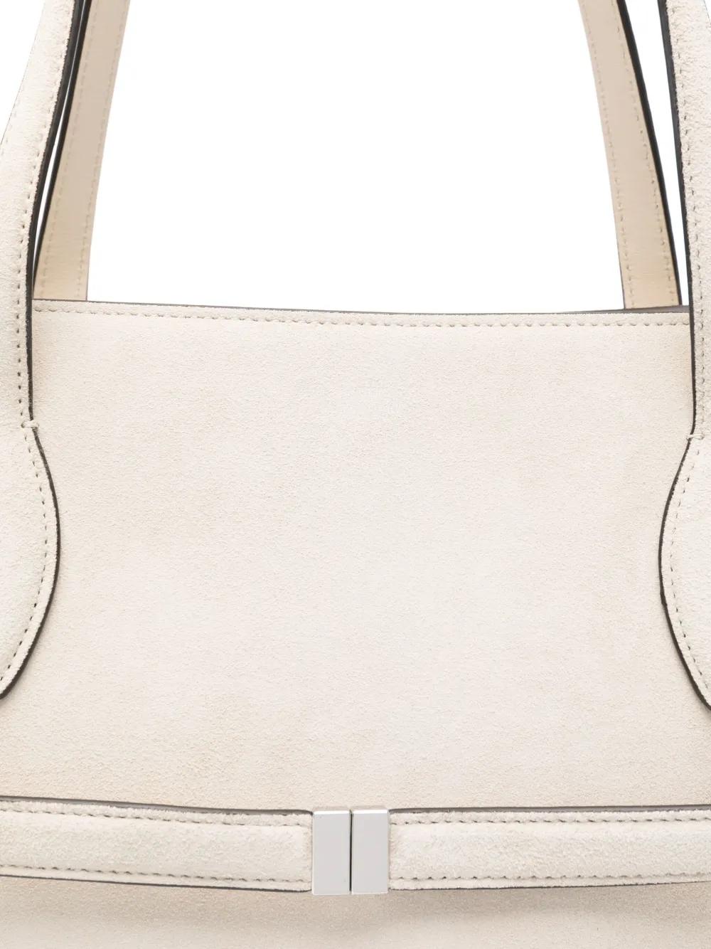 light beige suede top handles central clasp internal slip pocket This piece comes complete with a protective dust bag.