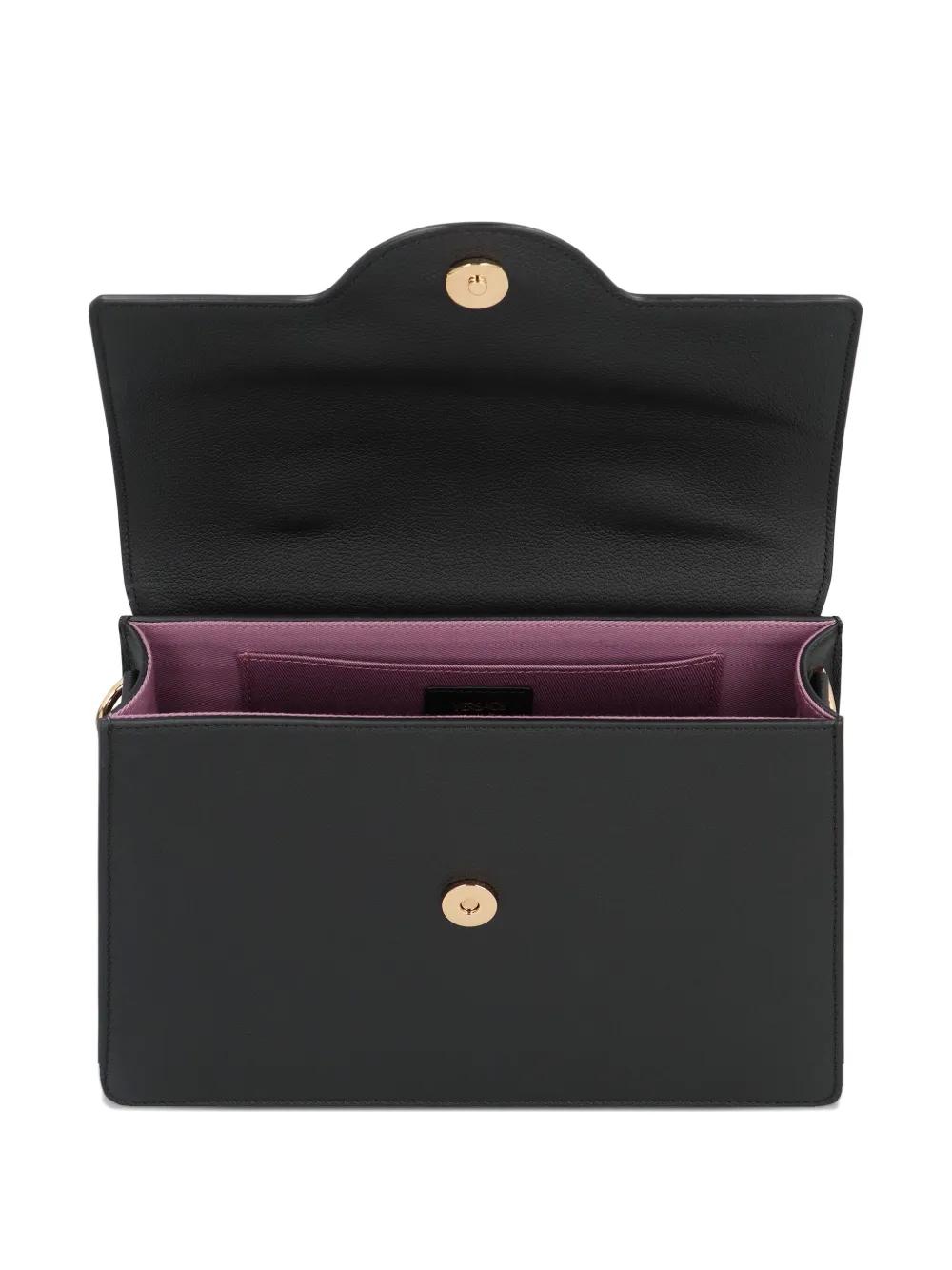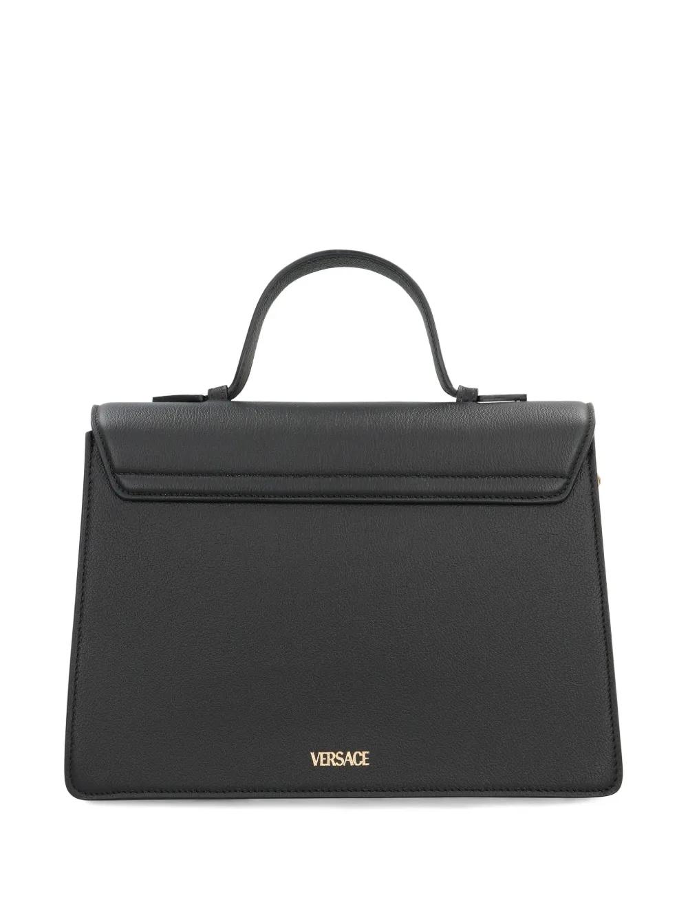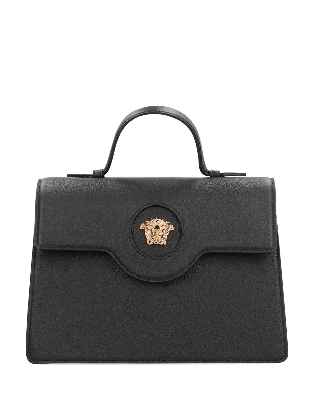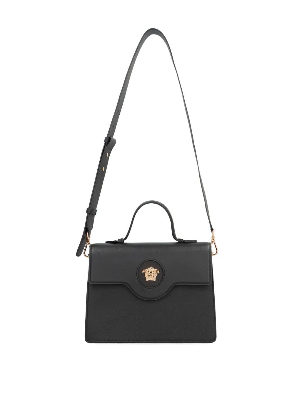 black leather Medusa plaque top handle removable adjustable shoulder strap gold-tone hardware
