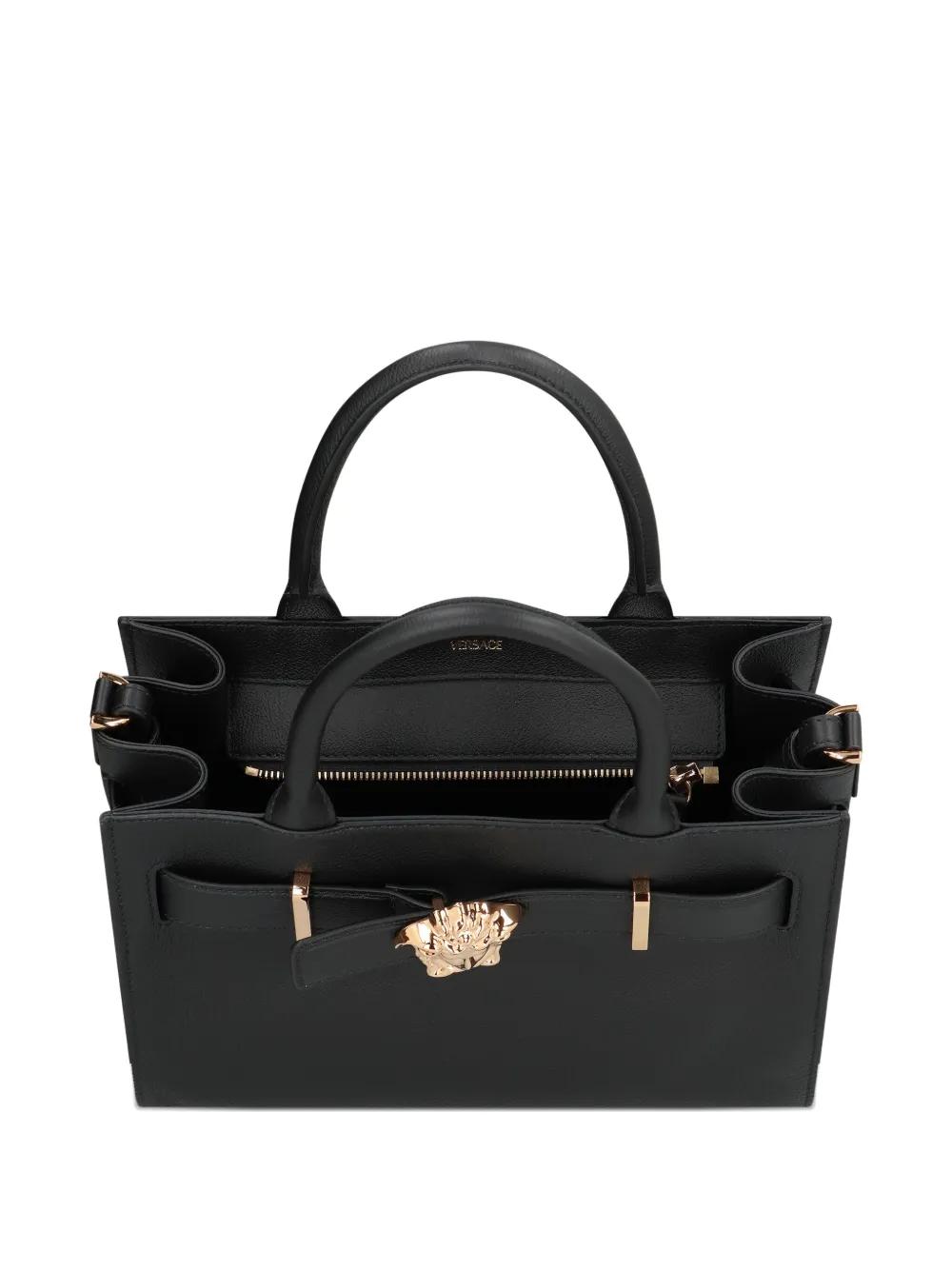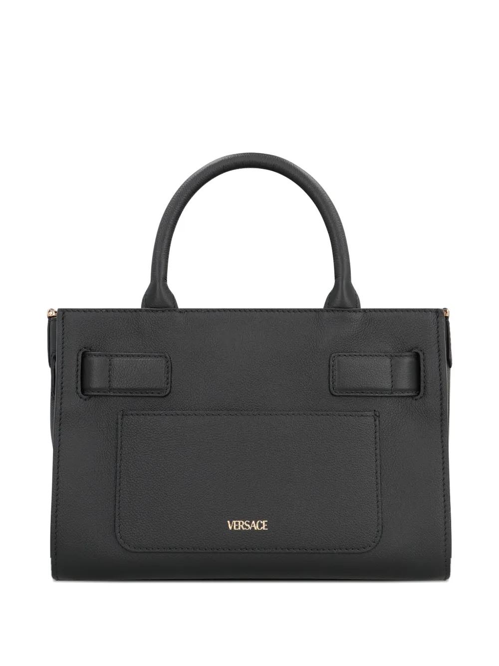black leather Medusa plaque top zip closure detachable shoulder strap gold-tone hardware back pocket