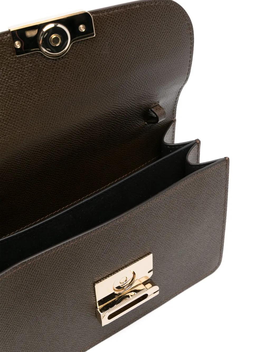 olive green calf leather grained texture foldover top with magnetic fastening adjustable shoulder strap logo print to the rear partitioned compartment internal patch pocket internal logo stamp contrast lining This piece comes complete with a protective dust bag.