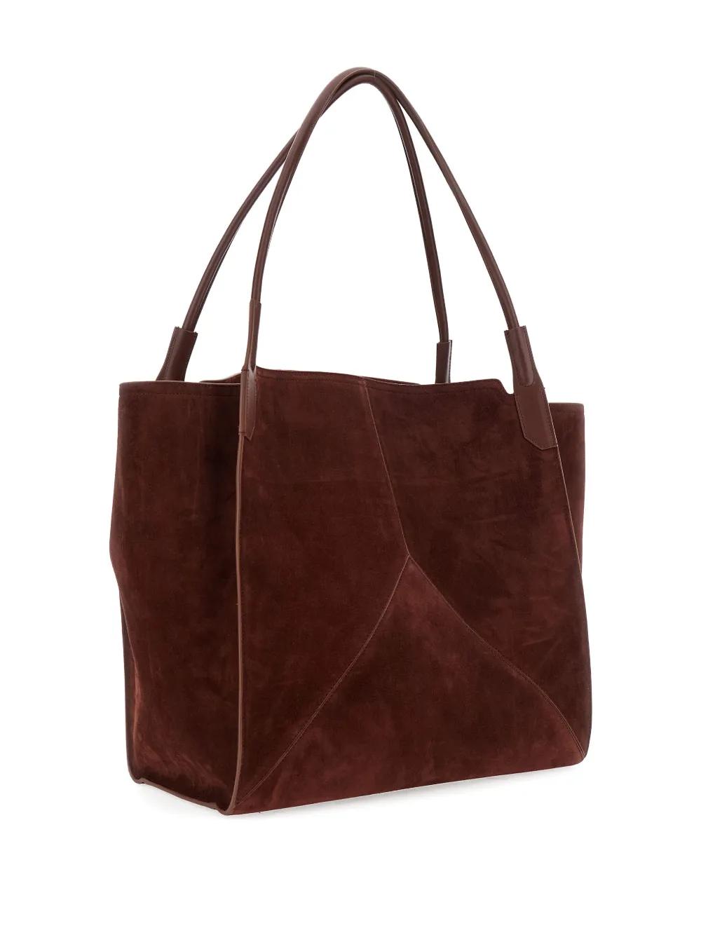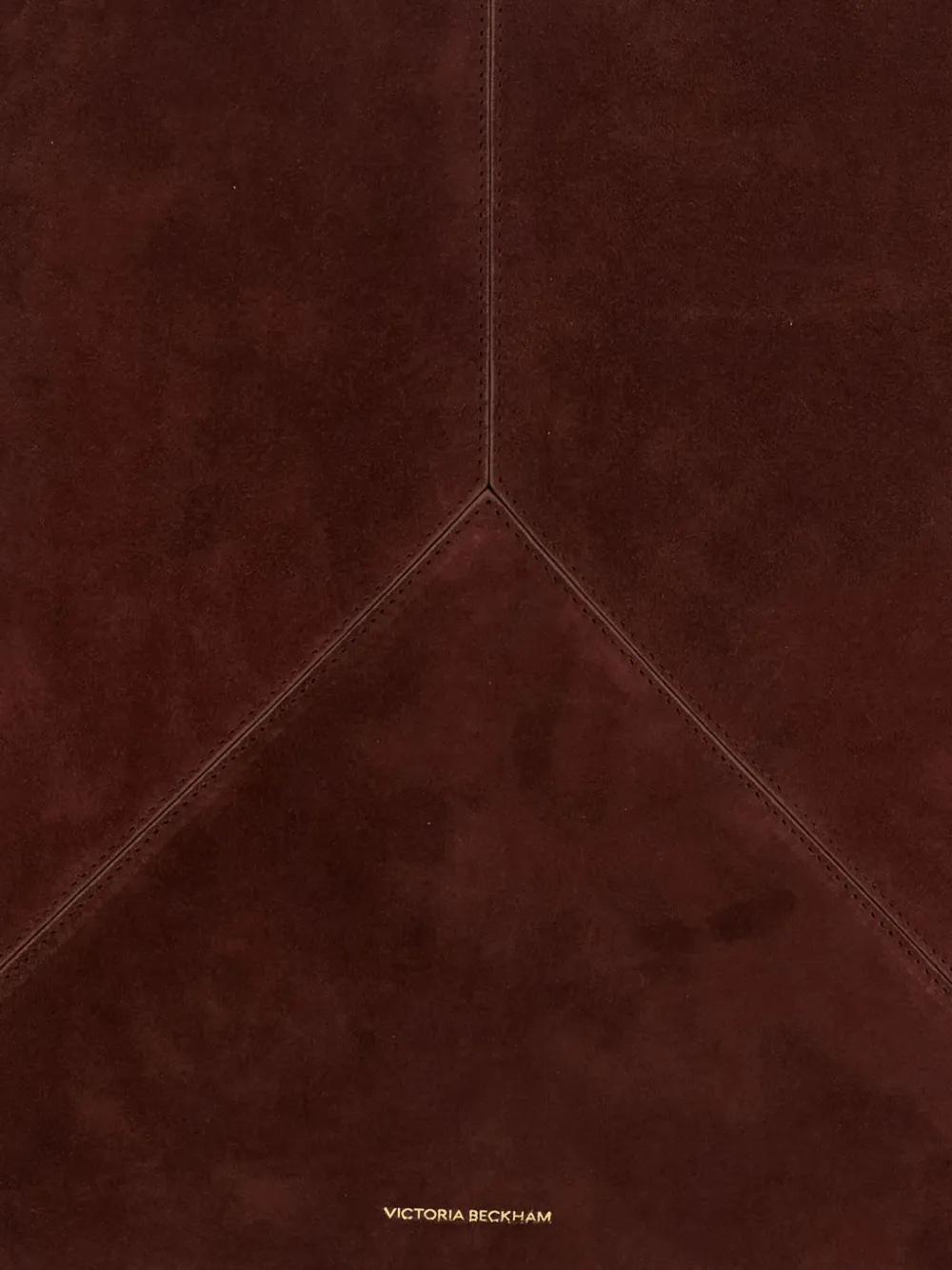 chocolate brown triangular panel detailing dual shoulder straps open top design embossed logo at base