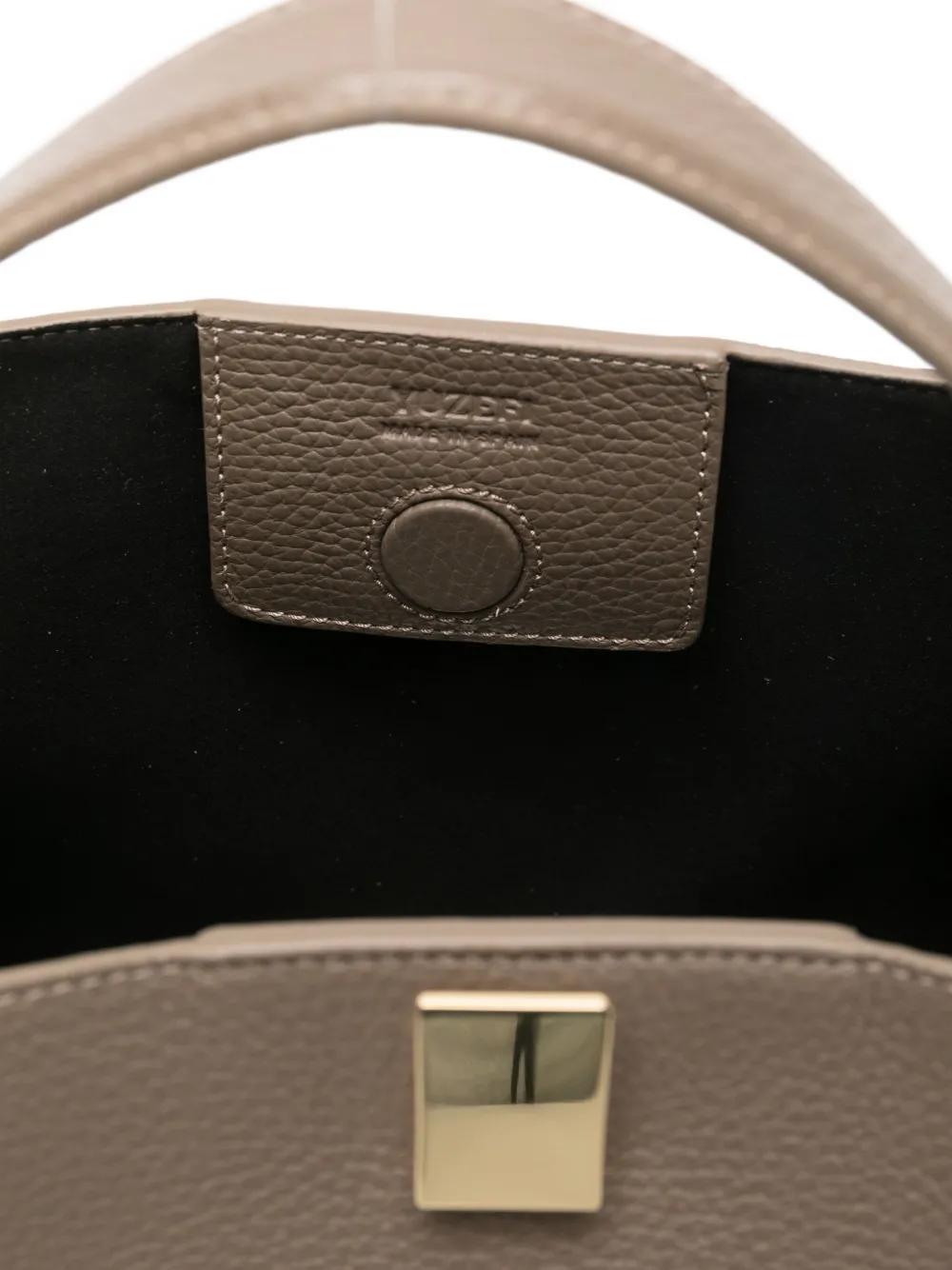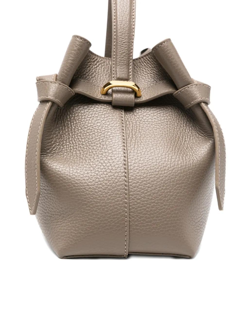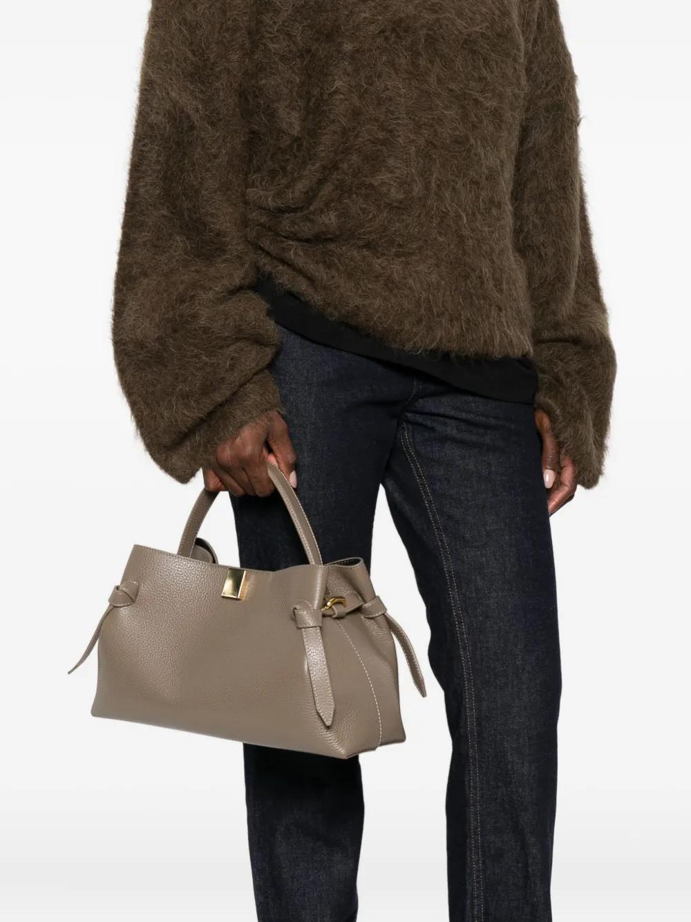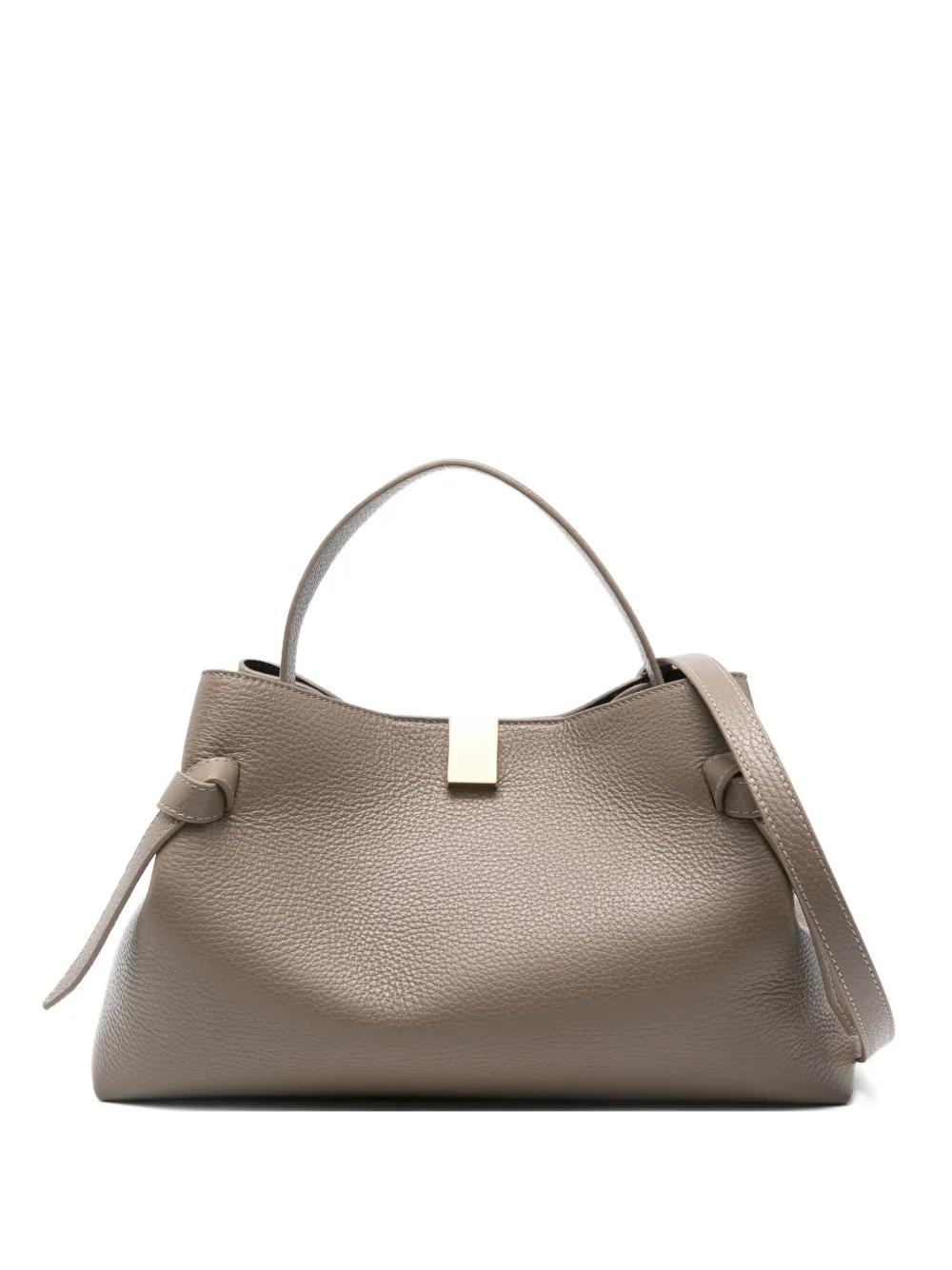 dove grey single top handle detachable shoulder strap gold-tone hardware knot detailing top fastening