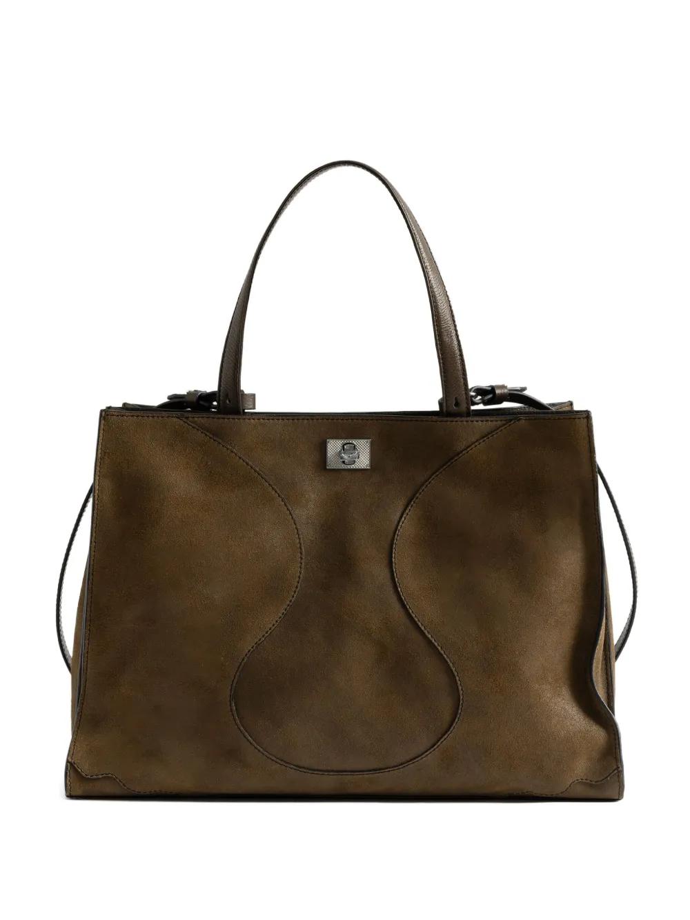 brown suede texture top handle clasp fastening curved panelling shoulder strap