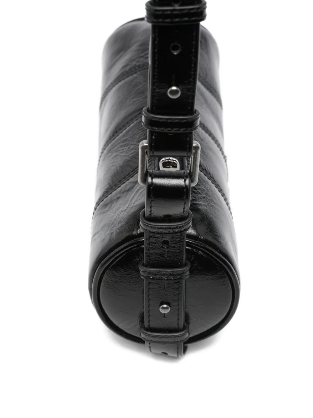 black patent leather cylindrical shape zip fastening adjustable strap signature wings logo plaque
