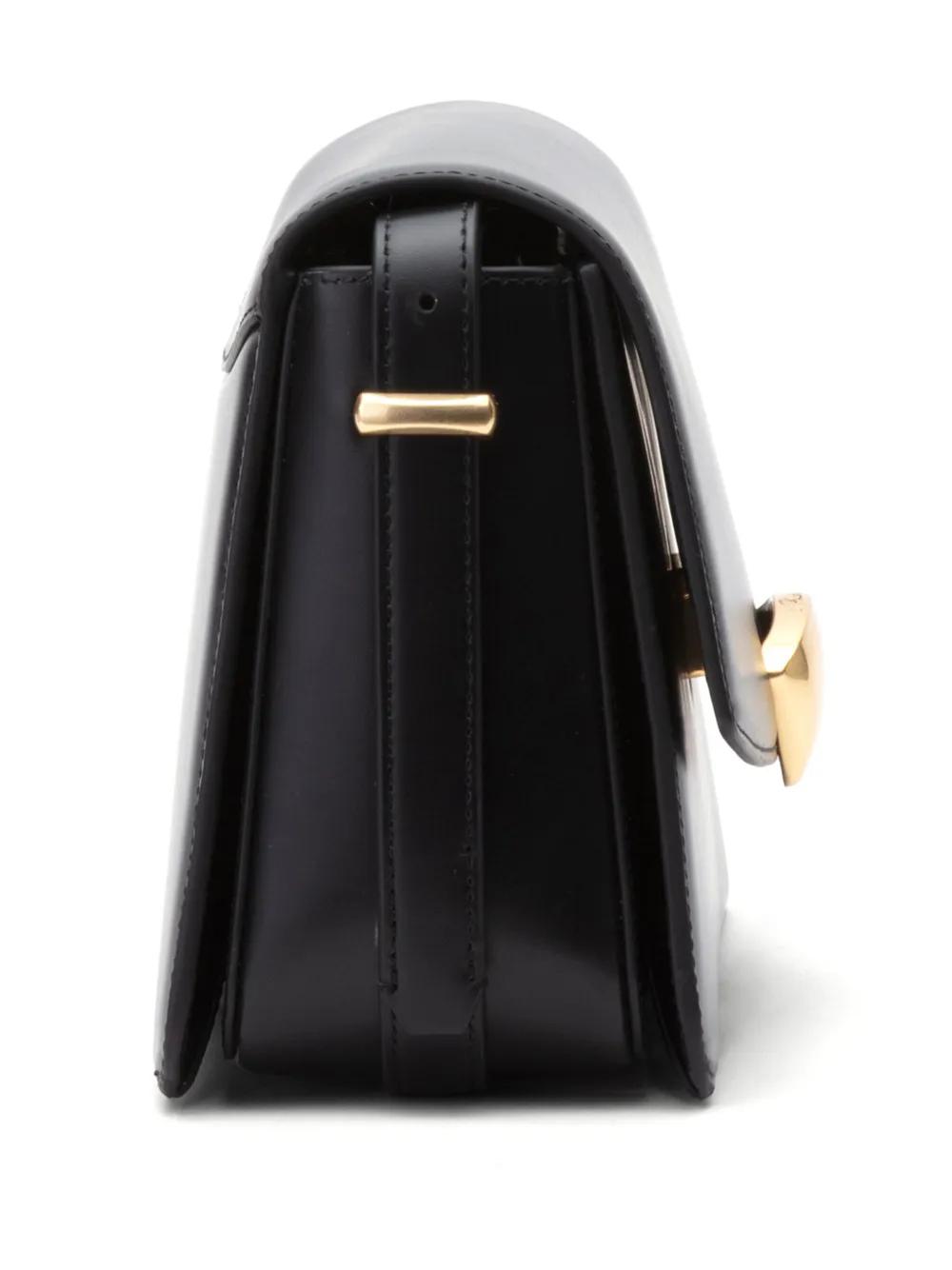 jet black calf leather smooth grain gold-tone hardware engraved logo adjustable shoulder strap foldover top with magnetic fastening main compartment cotton lining