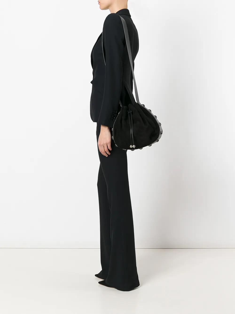 Black suede bucket crossbody bag from Alexander McQueen featuring a drawstring fastening, silver-tone hardware, an internal zipped pocket, an internal logo patch and an adjustable shoulder strap with hand painted button detailing.
