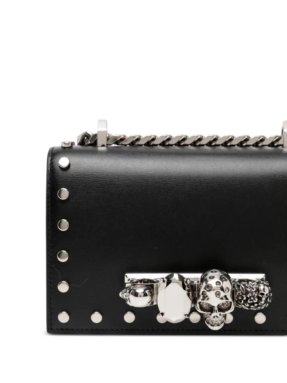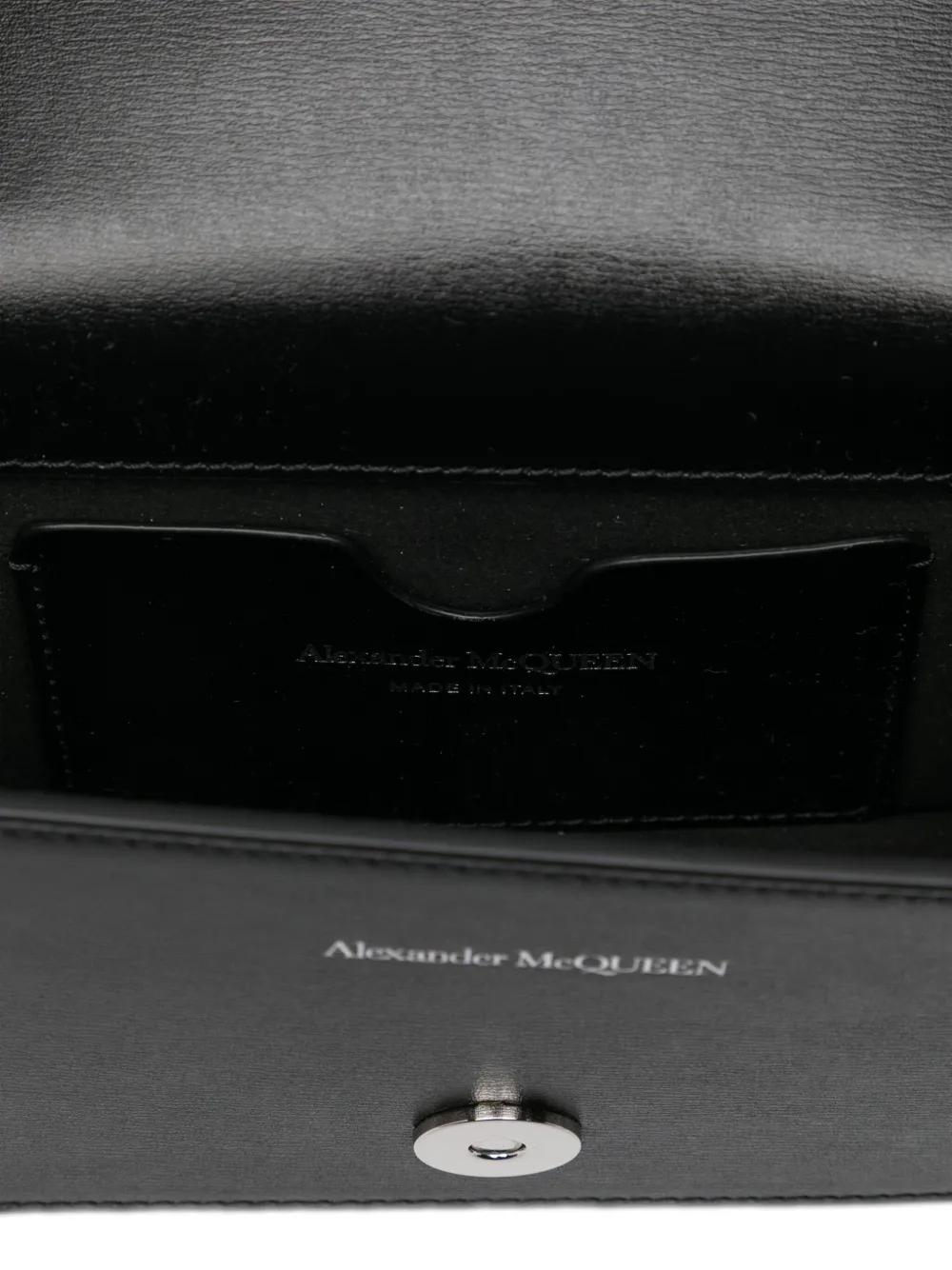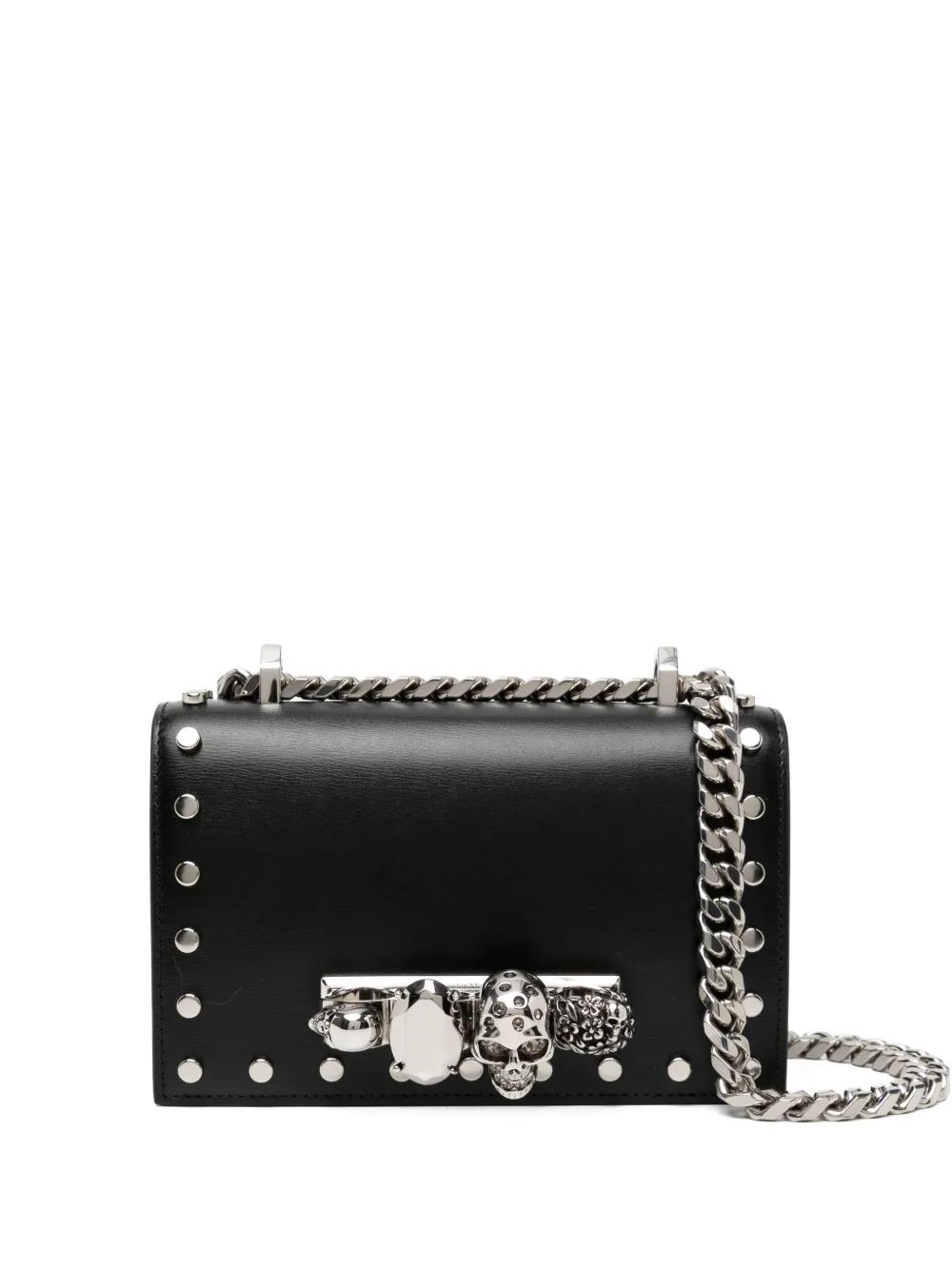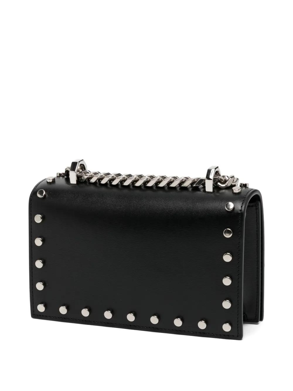 black concealed magnetic fastening front flap closure adjustable leather and chain-link shoulder strap main compartment