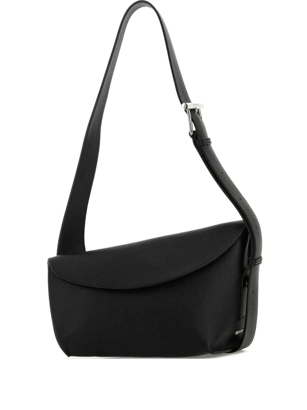 black leather t-bar fastening adjustable shoulder strap curved silhouette single compartment
