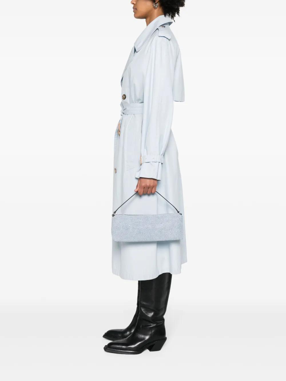 indigo blue denim crystal embellishment logo shoulder strap logo-engraved metal feet main compartment logo-jacquard lining internal logo stamp internal card slots silver-tone hardware top zip fastening This piece comes complete with a protective dust bag.