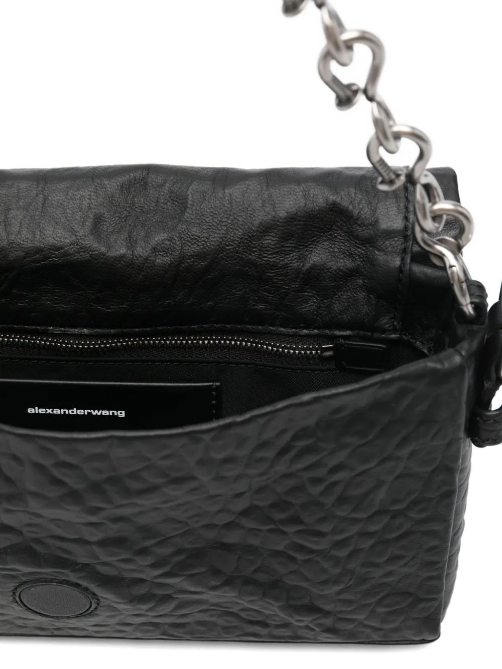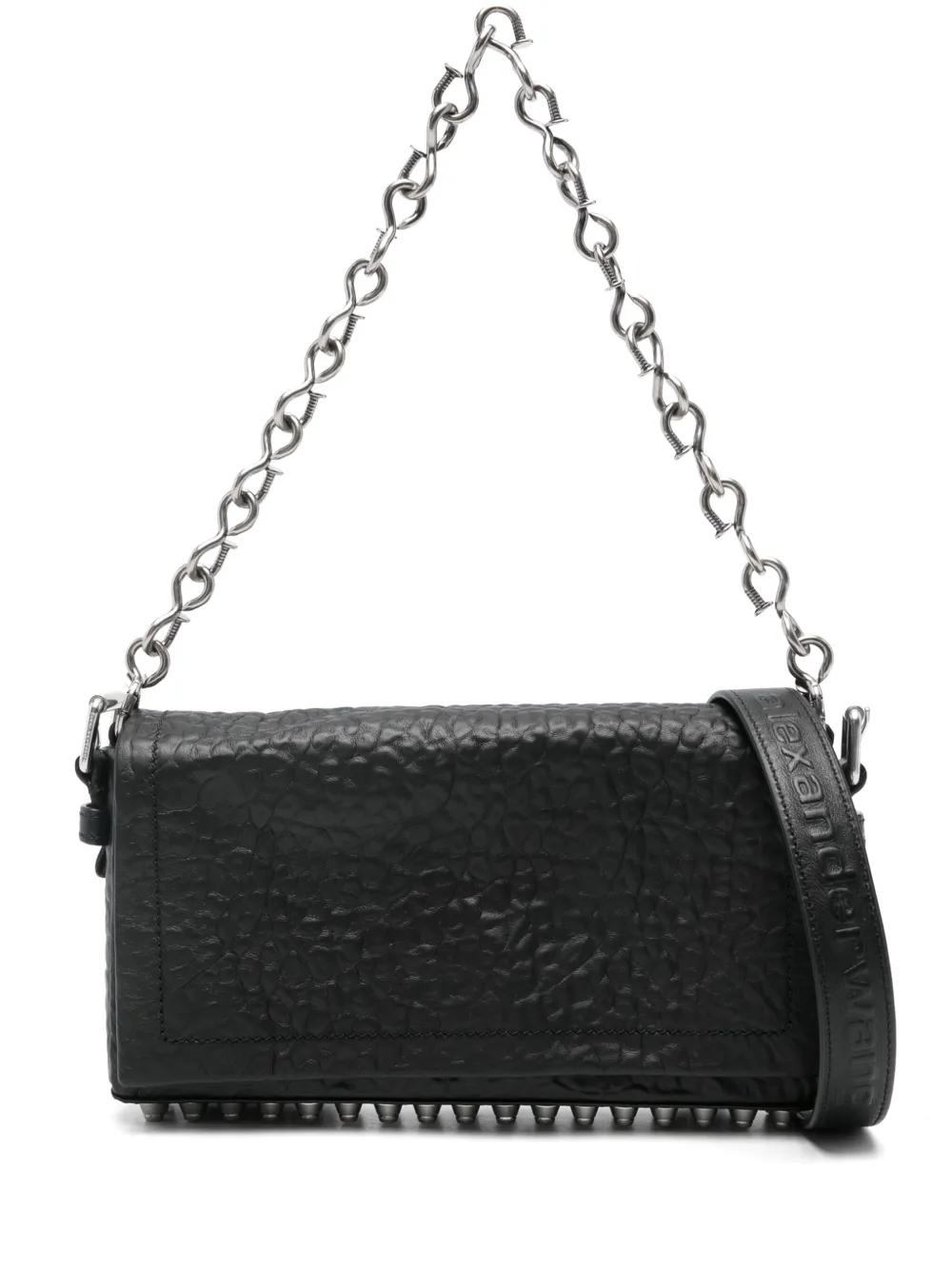 black crushed leather texture chain strap stud embellishment flap closure silver-tone hardware