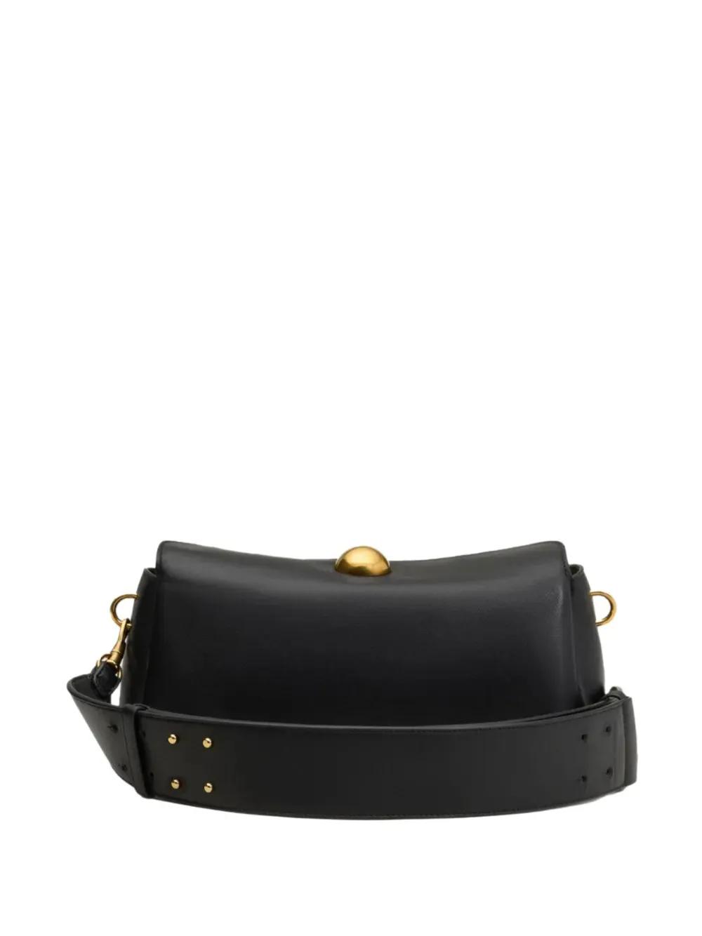 black calf leather adjustable removable shoulder strap brass hardware magnetic flap closure engraved logo