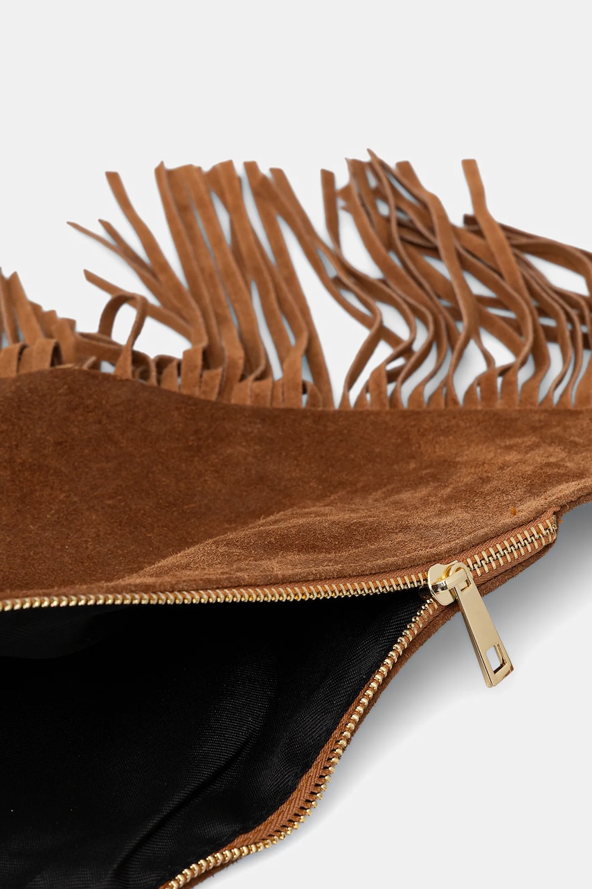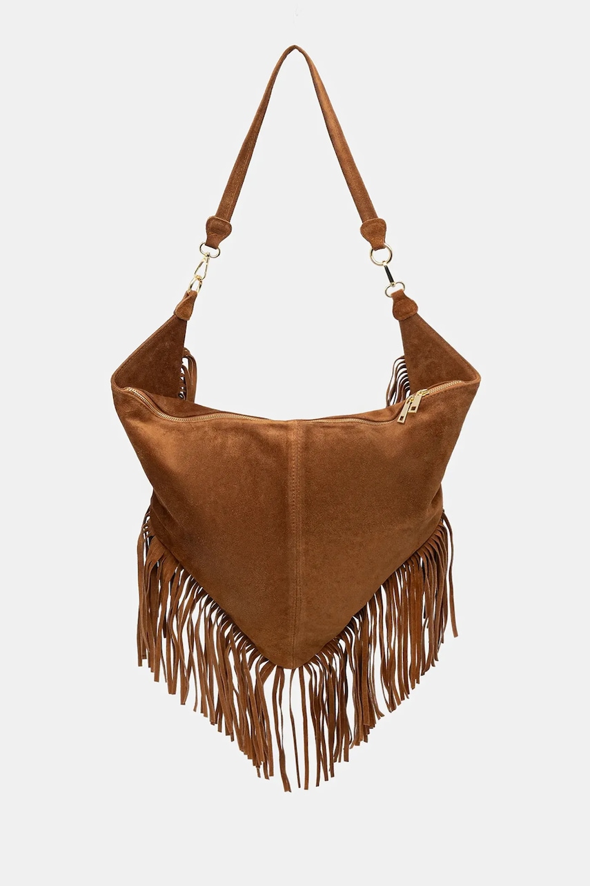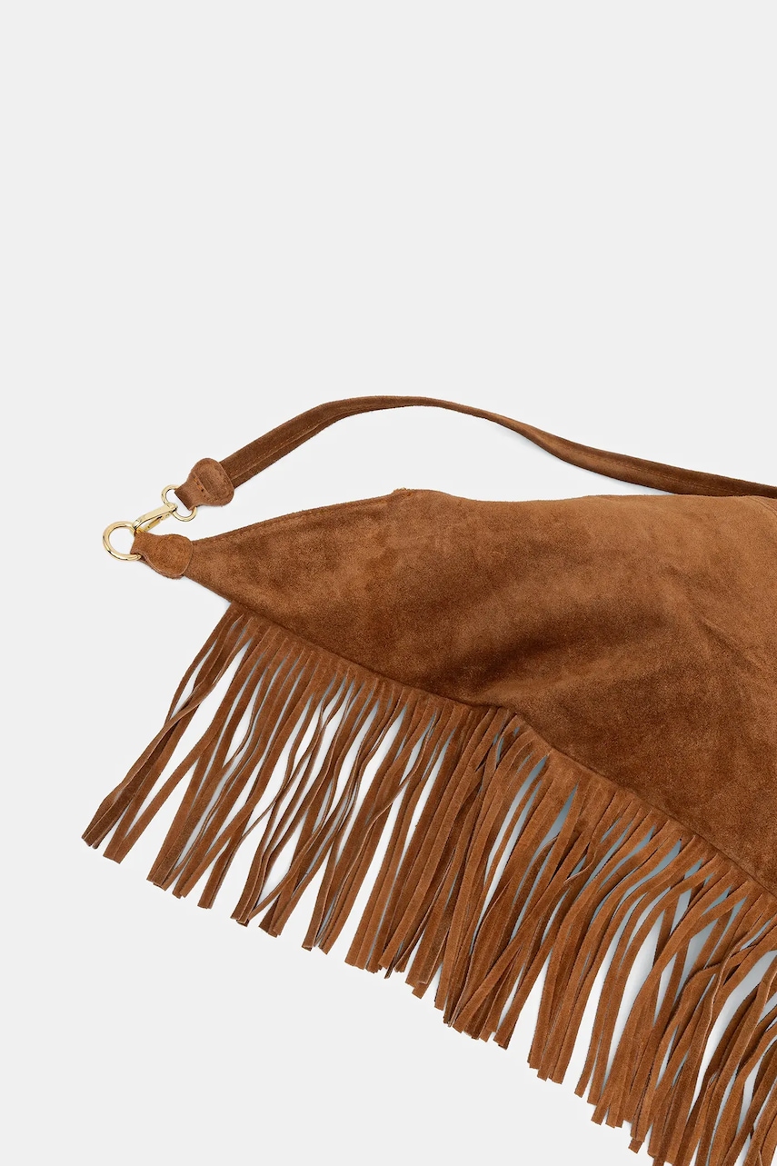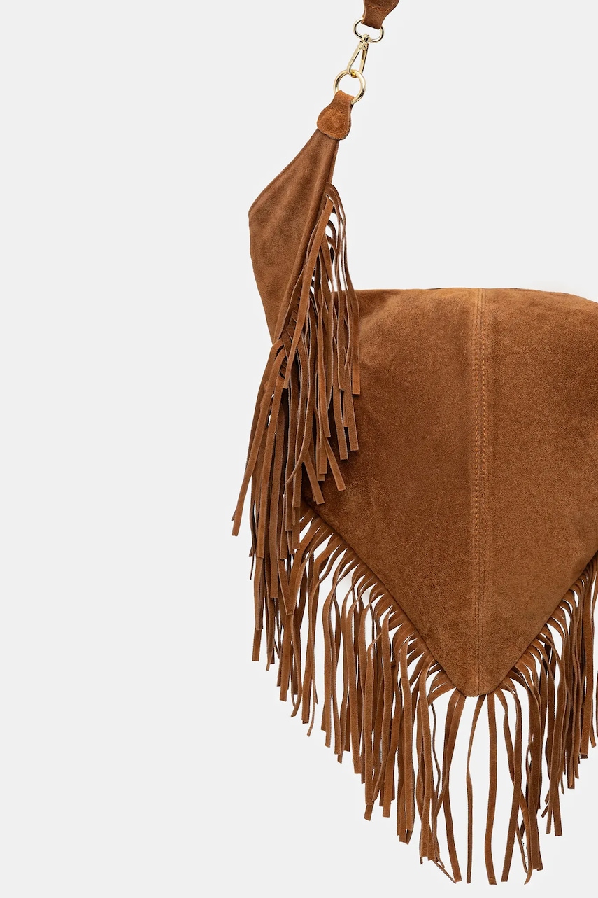 - Model z frędzlami. - Zapięcie na suwak. - Odpinany pasek bez regulacji. - Zapinana na suwak kieszonka wewnętrzna, która ułatwia bezpieczne przechowywanie telefonu lub innych drobiazgów. - Wewnętrzna, wsuwana kieszeń na telefon. - Mieści format A4. - Model z podszewką. - Dołączony tekstylny worek zabezpiecza produkt przed kurzem. - Długość paska: 59 cm. - Wysokość: 38 cm. - Szerokość u podstawy: 68 cm.