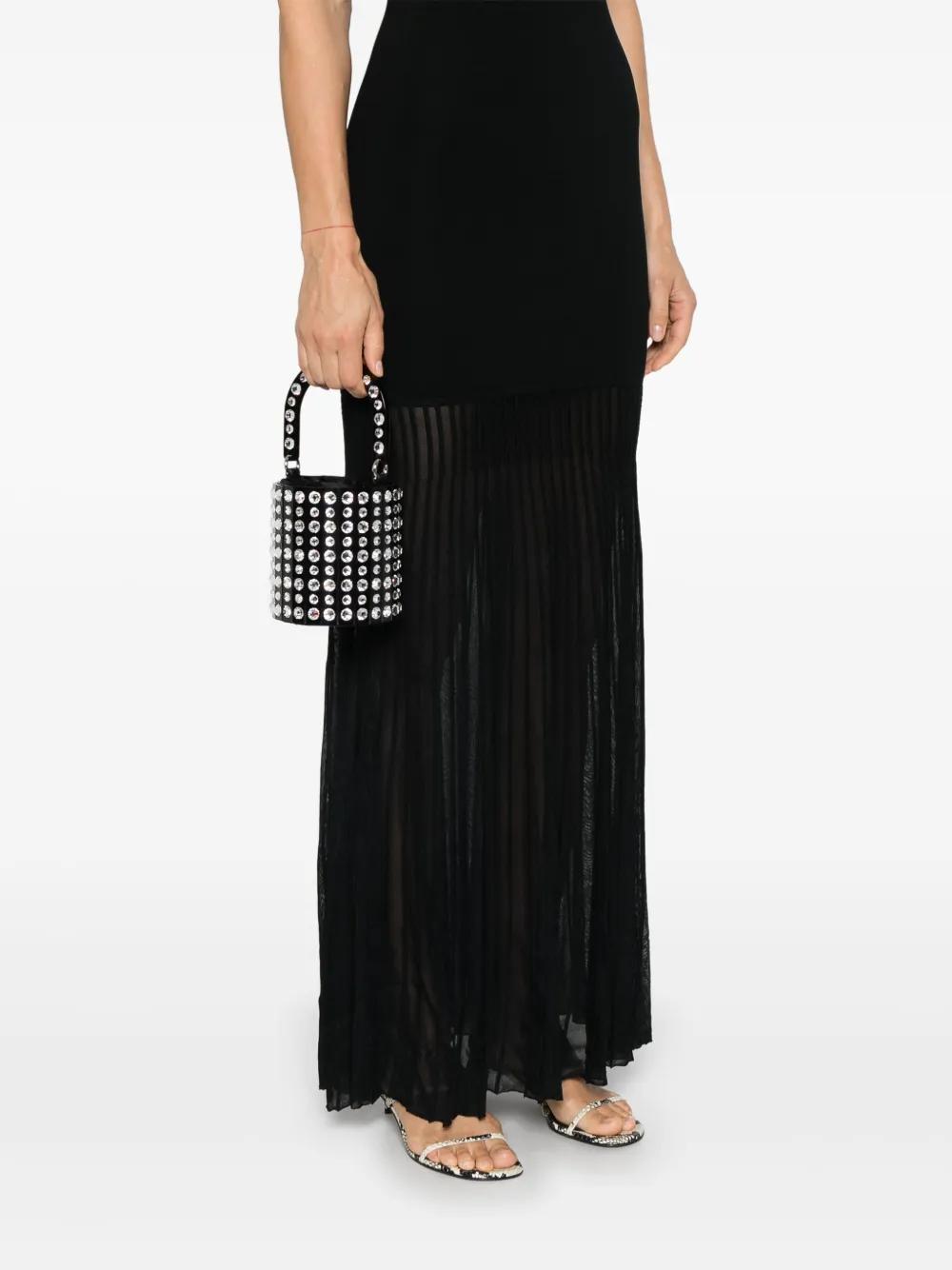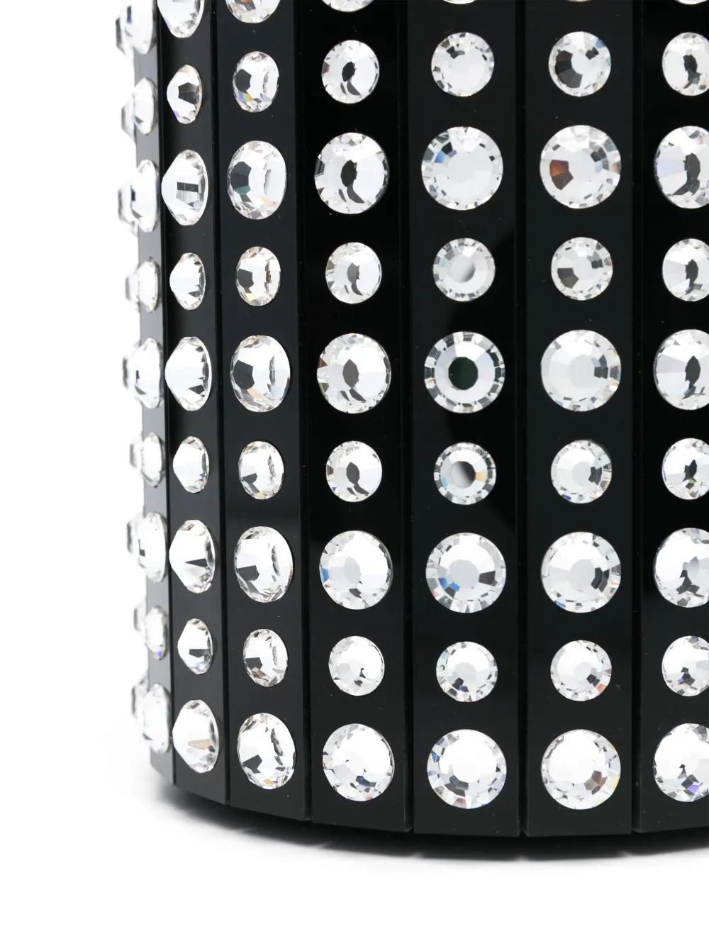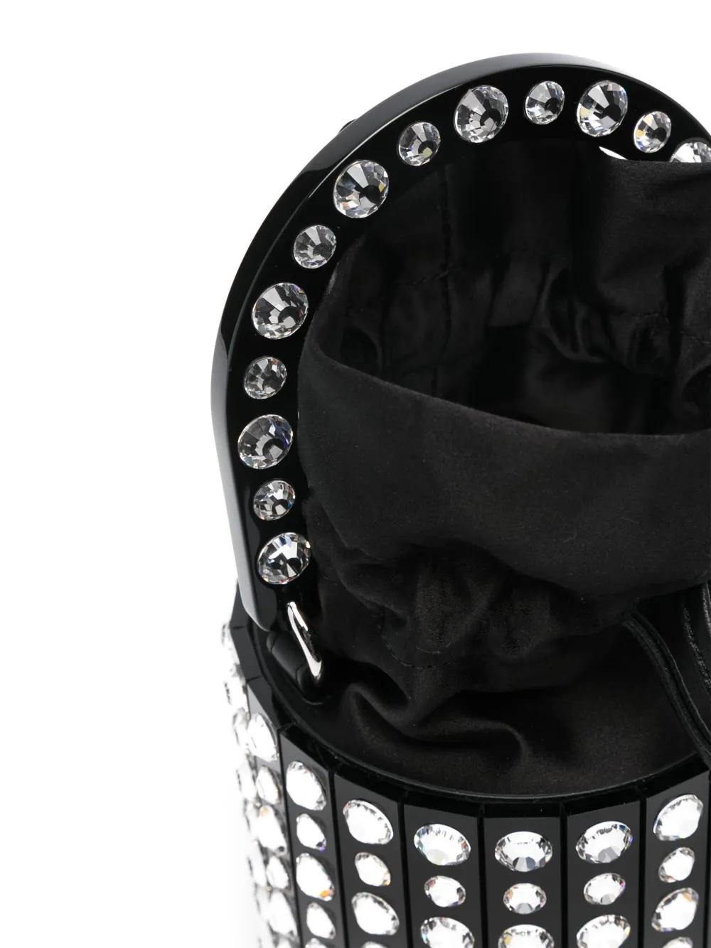 black panelled design top drawstring fastening single top handle detachable chain-link shoulder strap crystal embellishment main compartment full satin lining bucket body This piece comes complete with a protective dust bag.